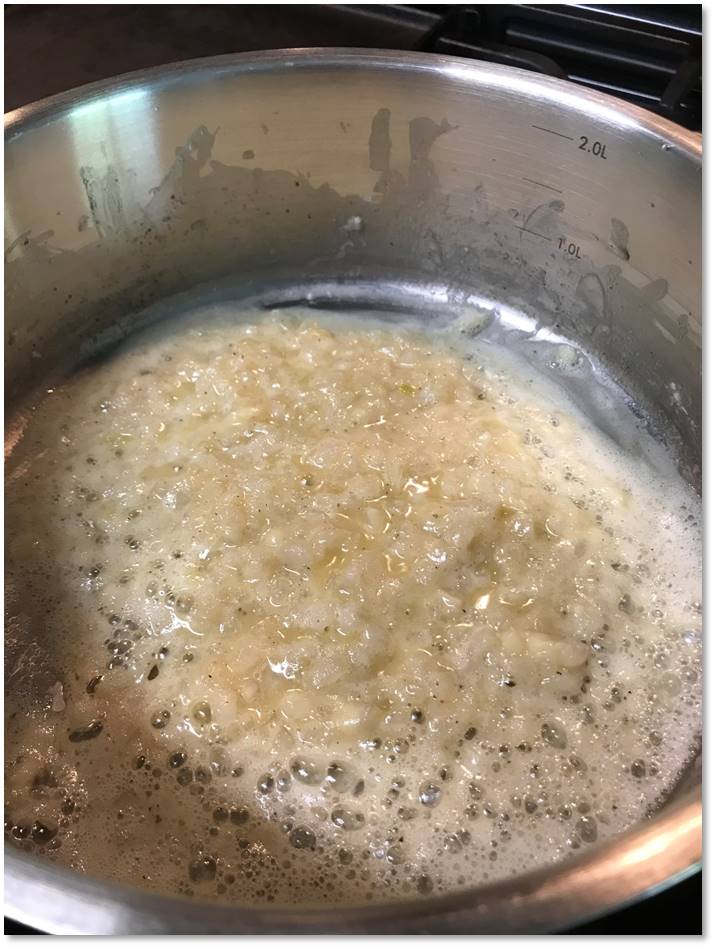 Over medium low heat, melt butter in your heavy-bottomed saucepan and add onions, simmering very slowly until they are soft and translucent. Do not rush this step. You don’t want the onions to brown, only to soften. This step should take about 6 to 8 minutes. Get the rest of your ingredients lined up, because it will go quickly from here.