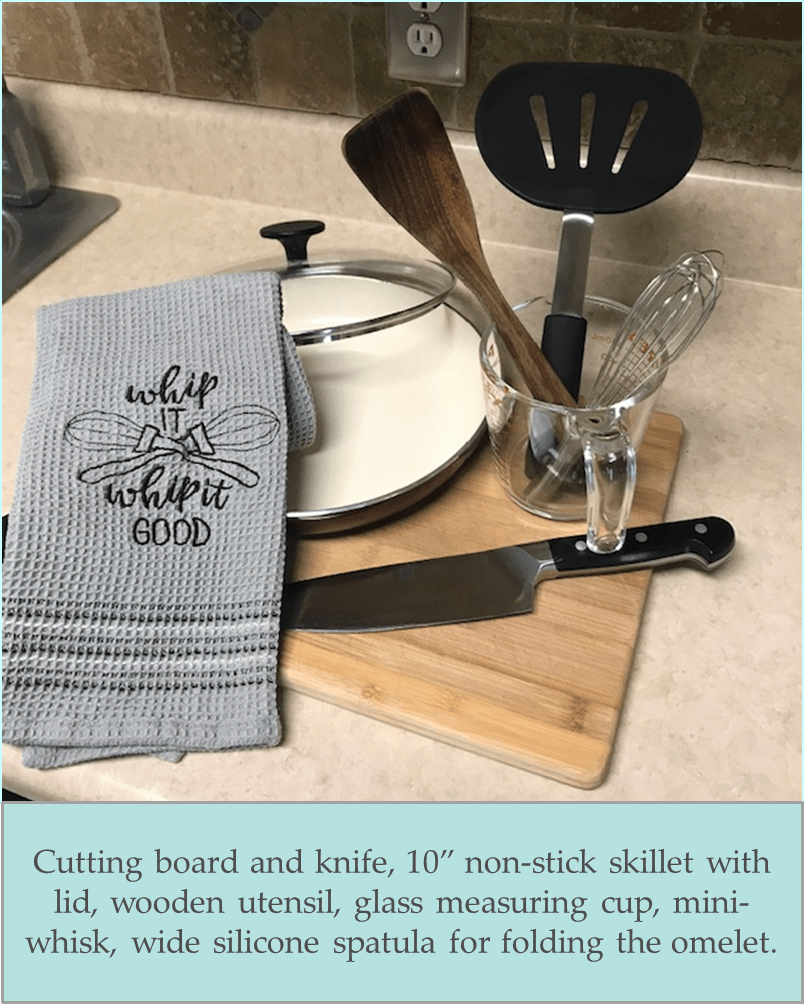 Years ago, my mom had one of those hinged, fold-over pans “designed for omelets,” but this is absolutely not necessary. It didn’t produce a fabulous omelet and mostly just made a mess. My go-to pan for omelets is a good non-stick skillet with curved sides. The shape and coating makes it easier to slide your spatula underneath the set egg mixture for folding and serving. If your skillet is not coated, swirl in a little extra oil just before adding the eggs, to guard against sticking.