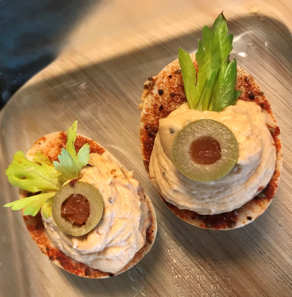 Filling: egg yolks, 1 Tbsp. mayo, 2 Tbsp. tomato paste, 1 Tbsp. prepared horseradish, a dash or two of hot sauce and/or Worcestershire sauce, salt and pepper to taste. Press cut side of egg white halves onto a plate sprinkled with Old Bay seasoning so when you turn them back over the rims are nicely coated and colored. Pipe filling into egg white halves; garnish with olive half and celery leaf.