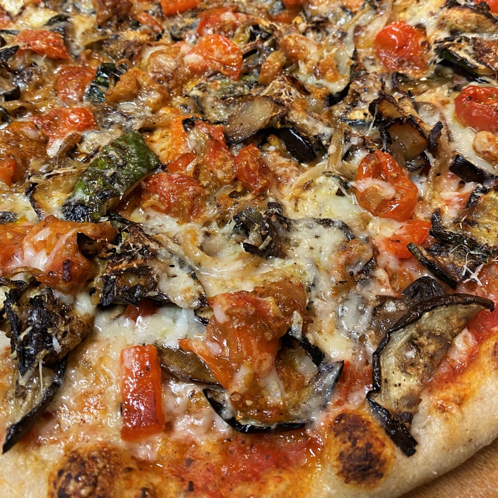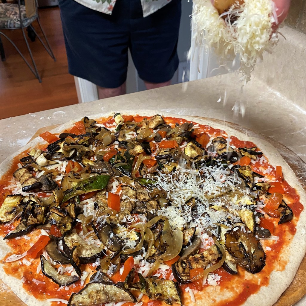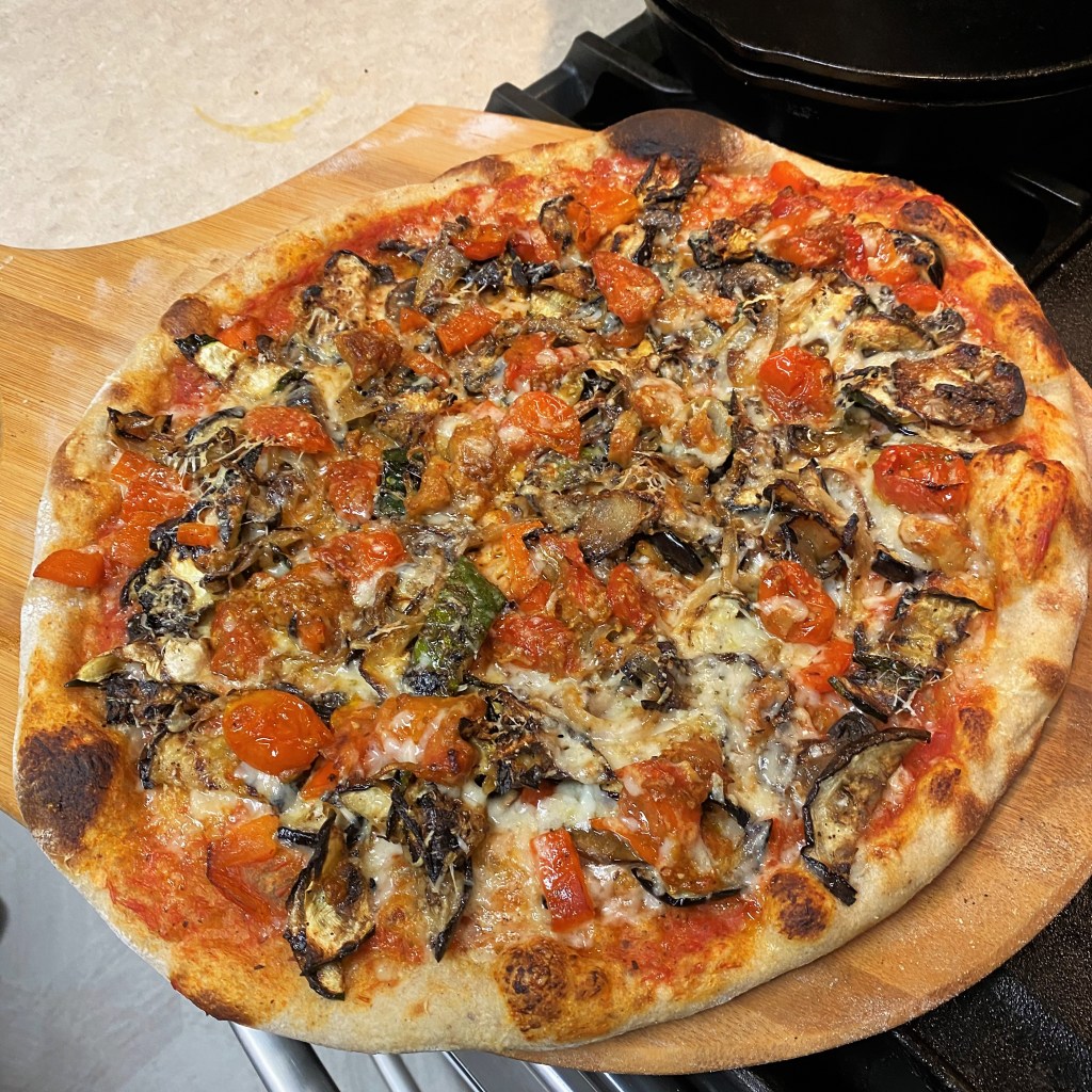 You don’t have to make your own dough to enjoy this pizza—before I made my own bread, I favored the Boboli pre-made crusts. There’s no judgment here if you want to use a pre-made pizza dough or other favorite crust and just focus on the flavors of the vegetables. Or trade in the crust altogether for a fresh bowl of hot pasta, tossed with the grilled vegetables and herb-infused sauce. Or really merge Italian into it by serving it on risotto or polenta. Re-imagine it exactly however you like. Isn’t that the beauty of comfort food?
