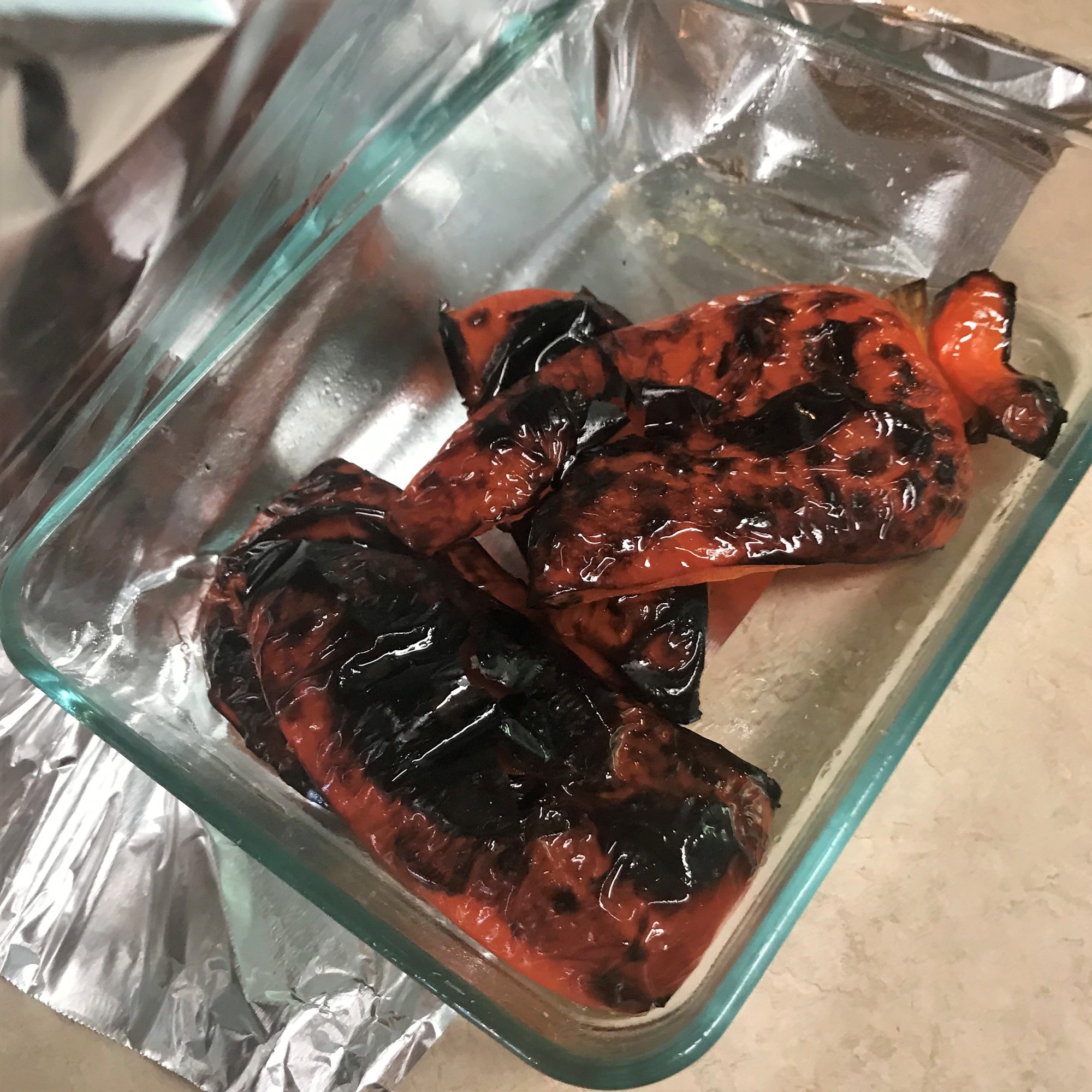 Place the grilled peppers in a bowl, cover with foil and wait 15 minutes until the skin is loosened enough to peel away. Cool all vegetables and chop into large, rough pieces.