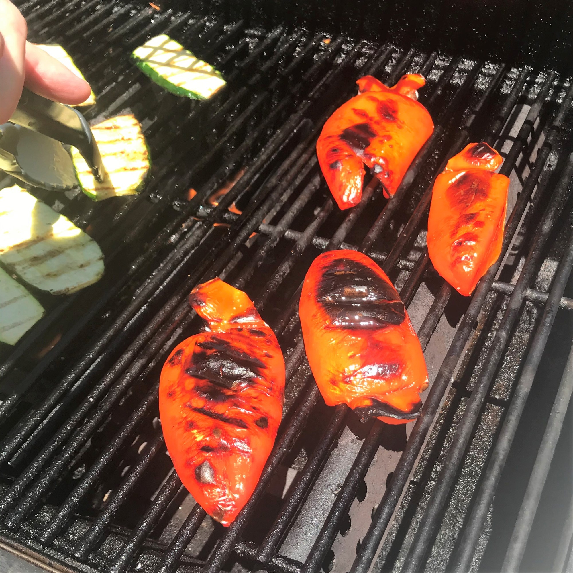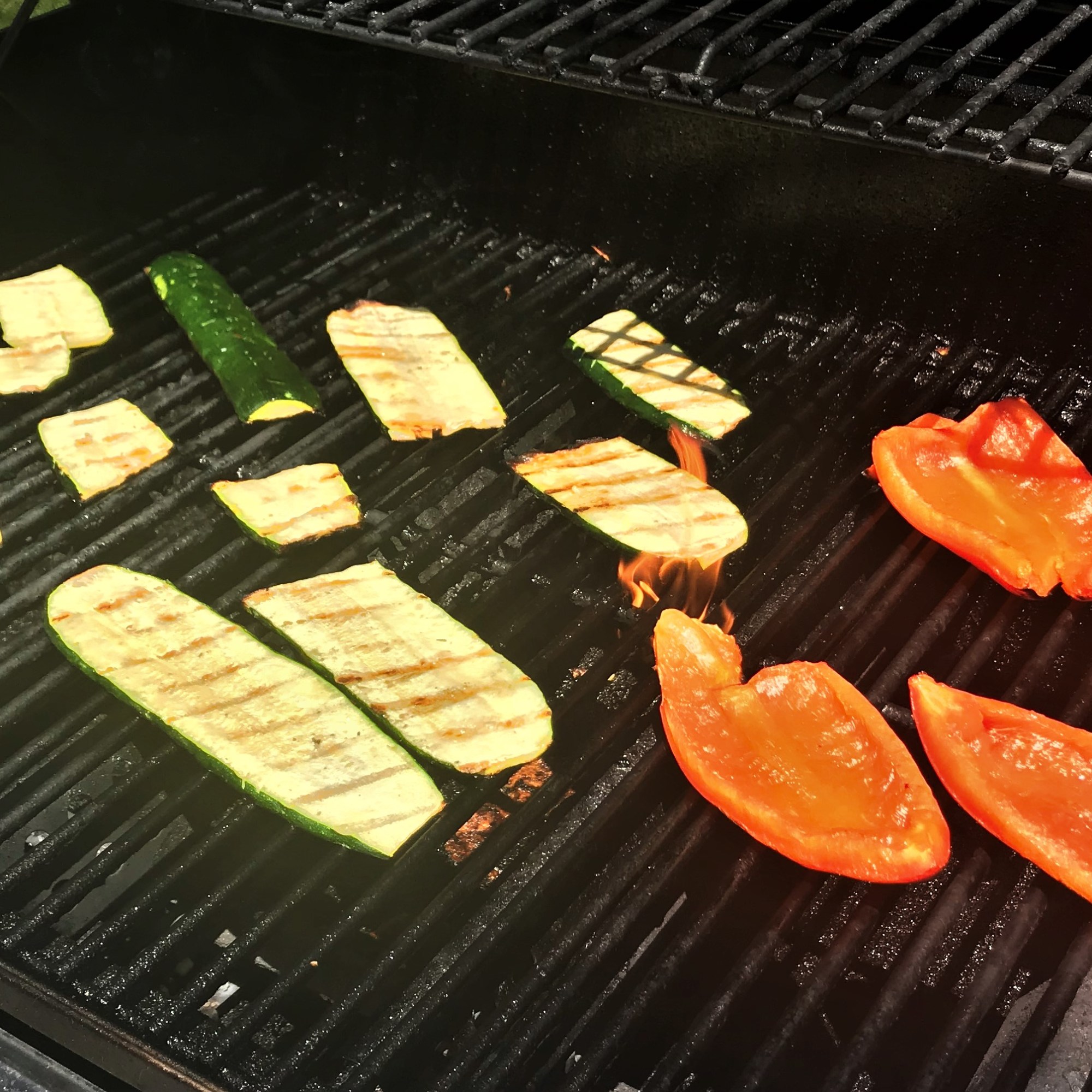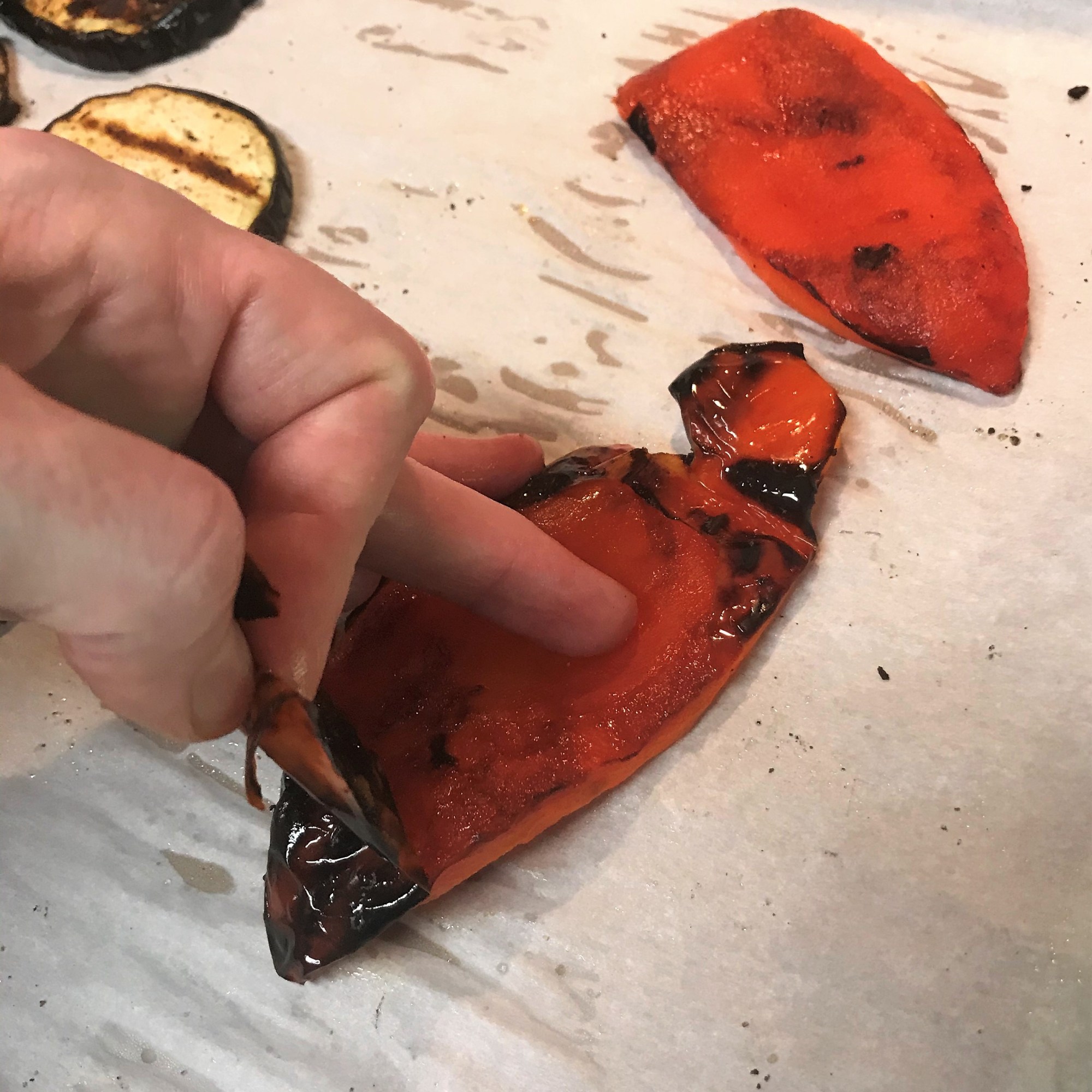 Spray or brush eggplant slices, zucchini and bell peppers with extra virgin olive oil. Season with salt and pepper, and grill at 350° F for approximately 10 minutes, or until they reach your preferred level of caramelization. We let them go until they were lightly charred, but still tender.