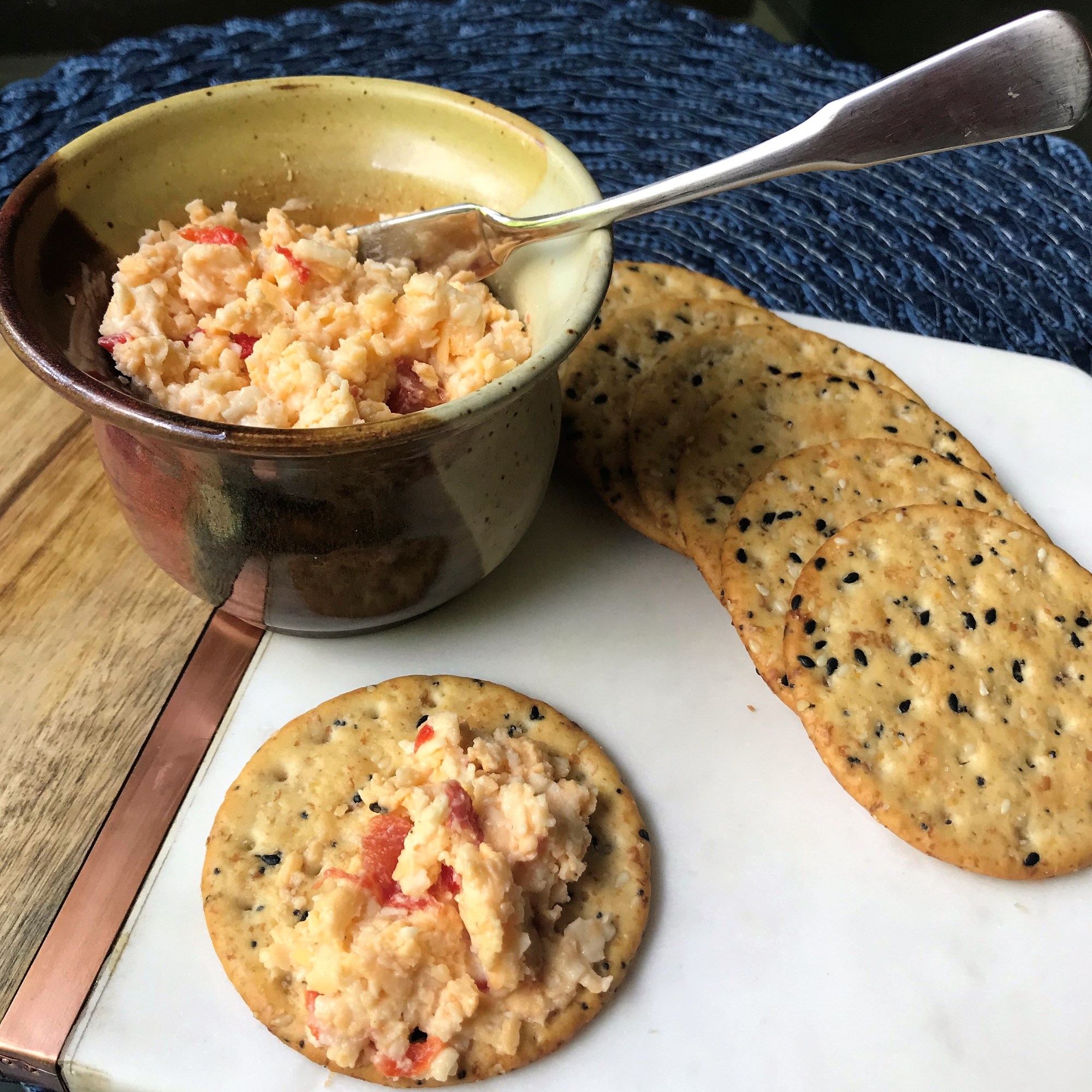 Our friends shared a lovely spread of cheeses and fresh fruit, plus cocktails and a surprise cordial to end our evening on a sweet note (I’ll be sharing more on that later). Les made his Homemade Pimiento Cheese, and I whipped up this Creamy Crab and Artichoke Dip.
