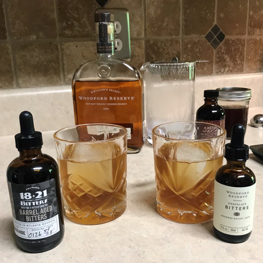 My husband and I have different taste, so I tried the drink with two different bitters varieties; chocolate for him and 18-21 “Havana & Hide” for me. Use any bitters you like. They don’t stand out much, but serve more to accentuate what’s already good about the drink. You can even skip the bitters and let the vanilla shine brighter.