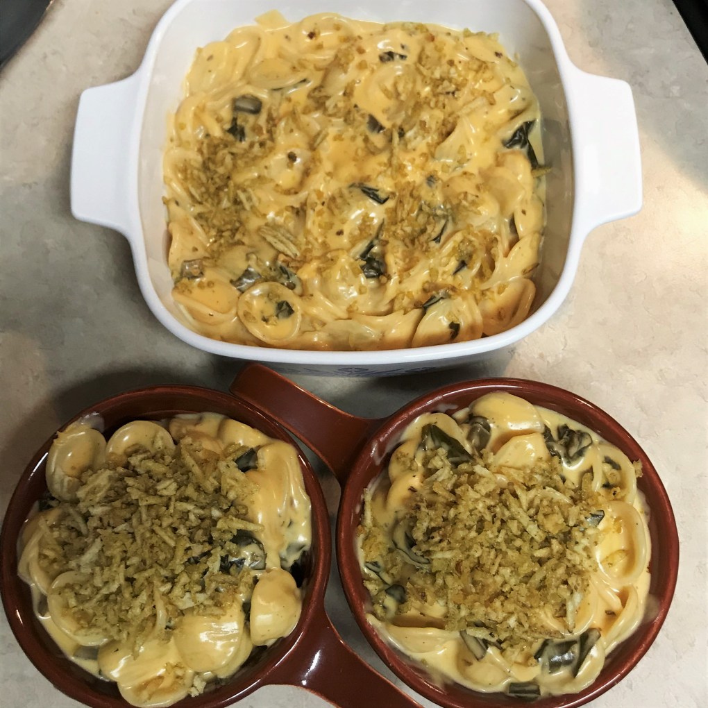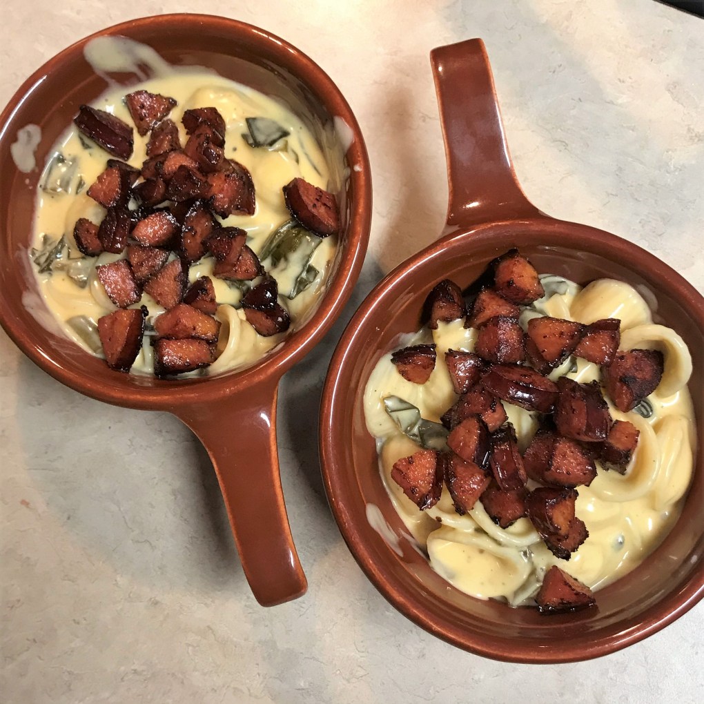 Kicked-up mac and cheese, baby. The sausage is cooked in smoke, so it has a nice firm texture, easy to cube and fry in a skillet until crispy. I’m inspired to add the collard greens because of a trip Les and I made to NYC in late 2018, and we took the subway up to Harlem for dinner at The Red Rooster, owned by celebrity chef Marcus Samuelsson. He has a popular dish on his menu called “mac and greens,” featuring (you guessed it) cooked collards.