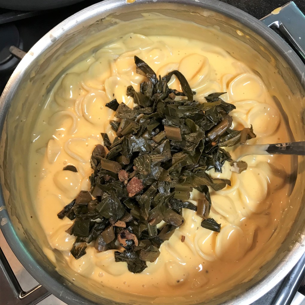 - Cook pasta to “early al dente” stage. It will soften further in the oven with the cheese sauce. Add finished pasta to cheese sauce, add cooked collard greens and stir until evenly combined.