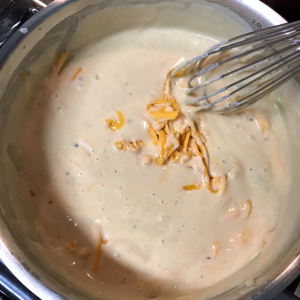 - Melt butter, cook flour until bubbly, add milk and whisk until smooth. Melt American cheese into the sauce and whisk until smooth. Add grated cheddar, whisk until smooth.