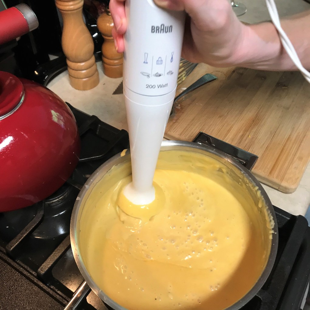 For starters, get some American cheese for the melting quality that cannot be matched with only block cheeses. The rest of the cheese is best freshly grated rather than pre-shredded in a bag. We are looking for extreme creaminess, and if you have an immersion blender, pull it out of the cabinet because that is my secret weapon for the silkiest, creamiest cheese sauce in minutes. Ready?