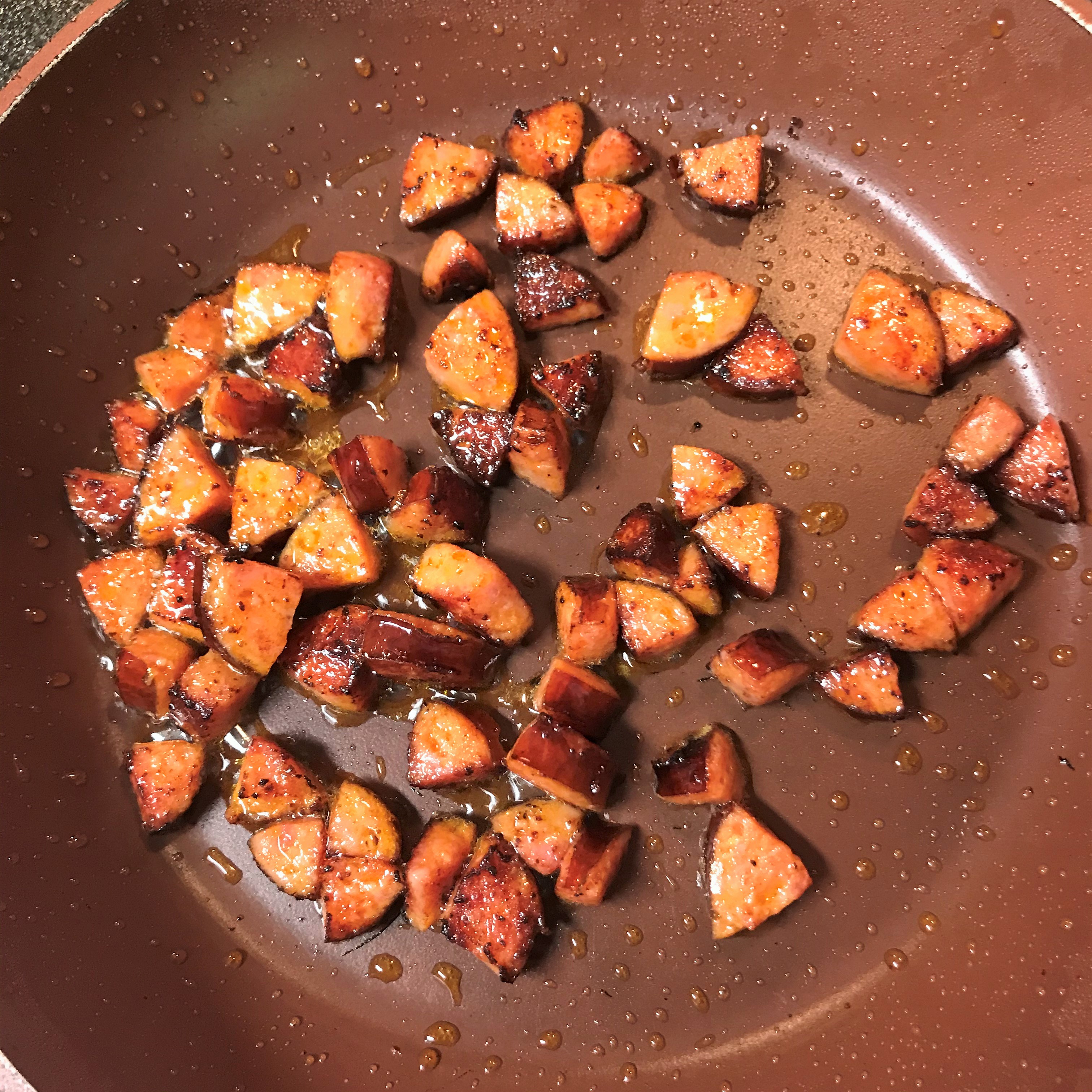- Cut smoked sausage into bite sized pieces, cook in small hot skillet to crisp up the edges of the sausage.