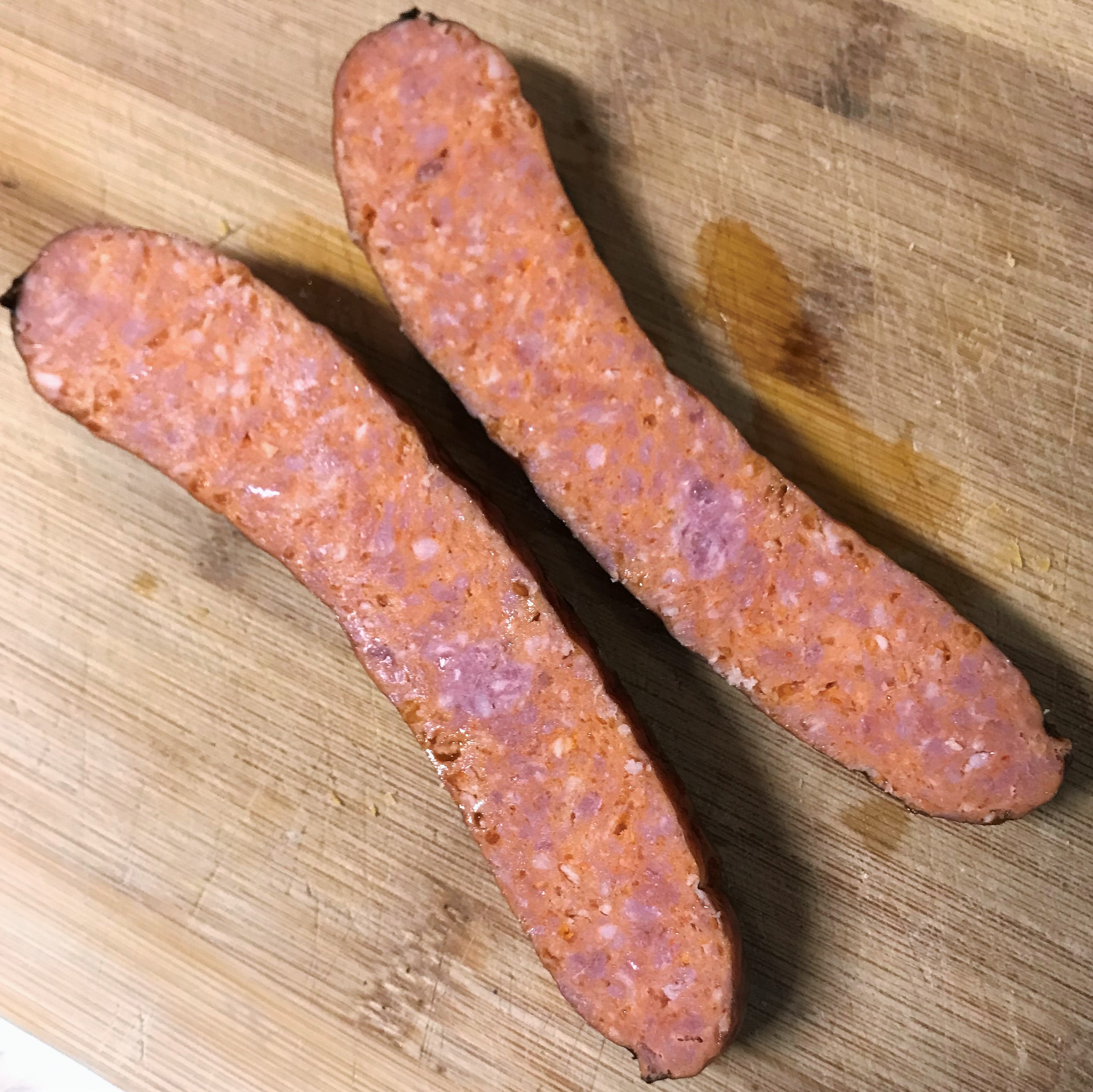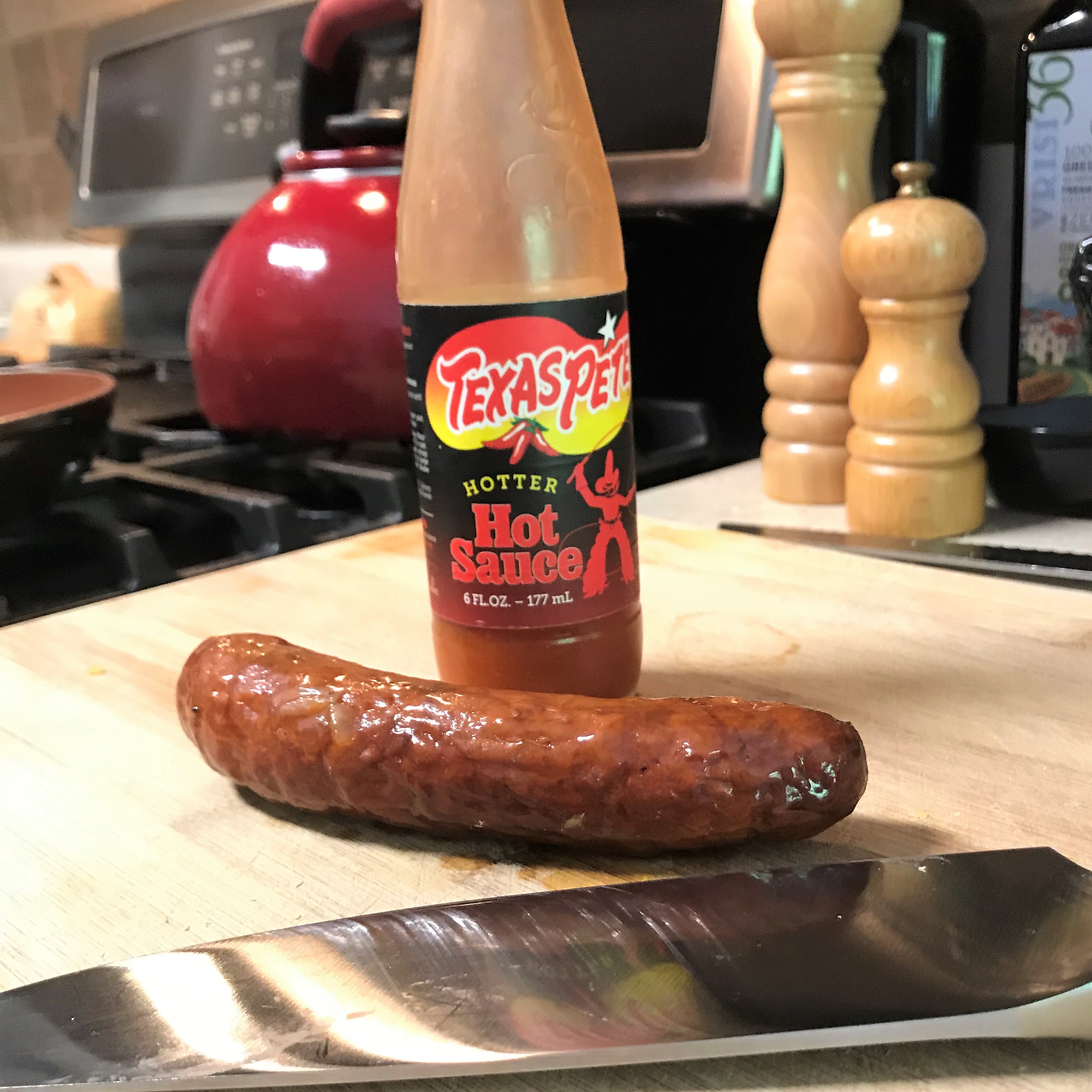 1 leftover “Texas Pete” smoked sausage*