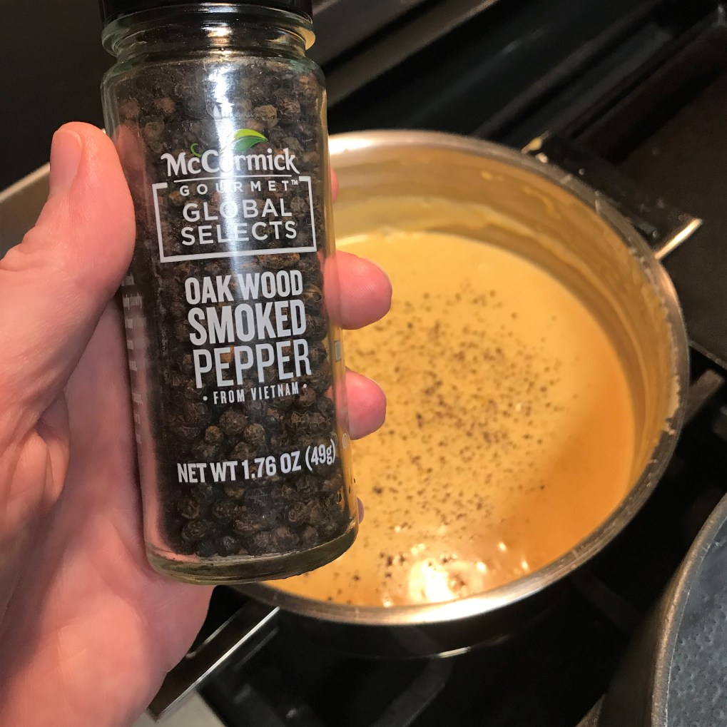 - Use immersion blender to emulsify cheese into an ultra-smooth mixture. Season with smoked black pepper.