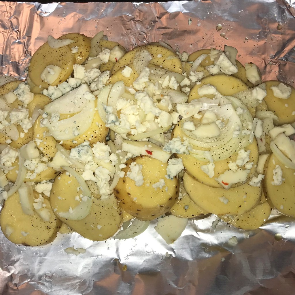 We won this battle at our house recently with a twice-grilled meatloaf, which we served up with these cheesy-good, grilled scalloped potatoes. This Comfort du Jour twist was simple to whip up because it doesn’t involve a cream sauce (that would be a disaster on the grill), but it was every bit as delicious, with tender potatoes, thin slices of onion and two kinds of cheese—pepper jack for a little kick, and crumbled bleu cheese for an interesting touch of funk. The potatoes were great just like this, but I’m certain they’d also be good with cheddar, smoked gouda or any other favorite cheese.