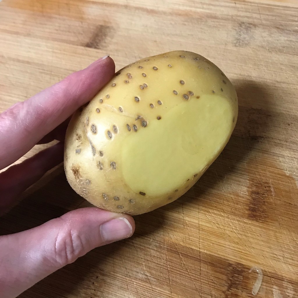 Whole potatoes can slip really easily when you’re trying to slice them thin. Either use a mandoline (be careful there, too), or try this easy trick. Slice a very thin section off one side of the potato, so it will lay flat on your cutting board, making it easier to safely cut it into slices.