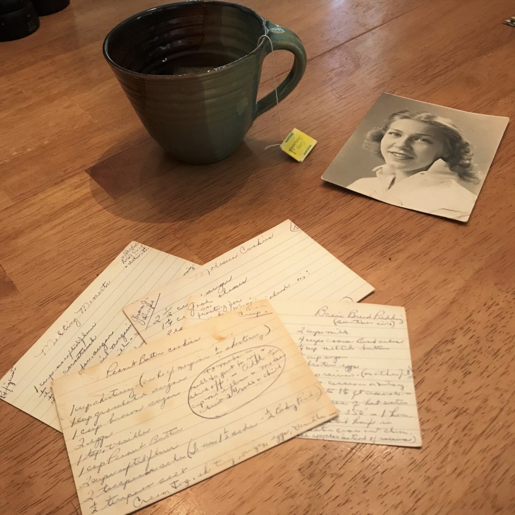 But in this moment, quiet at last after the ruckus of delivery and setup, all I wanted was a cup of tea. I set my red tea kettle on the back burner and lit the flame beneath it. Then I reached for my small black recipe box and, through hot tears that finally came, I sat down and thumbed through the index cards in search of the ones scrawled with Gram’s own handwriting—molasses cookies, melting moments, peanut butter cookies (“real crisp,” she wrote), basic bread pudding. Only four cards, I thought? Surely I have more of her recipes? Of course, they’re in my heart. More tears. And then, the sharp whistle of the kettle that stopped all at once when I turned off the burner.