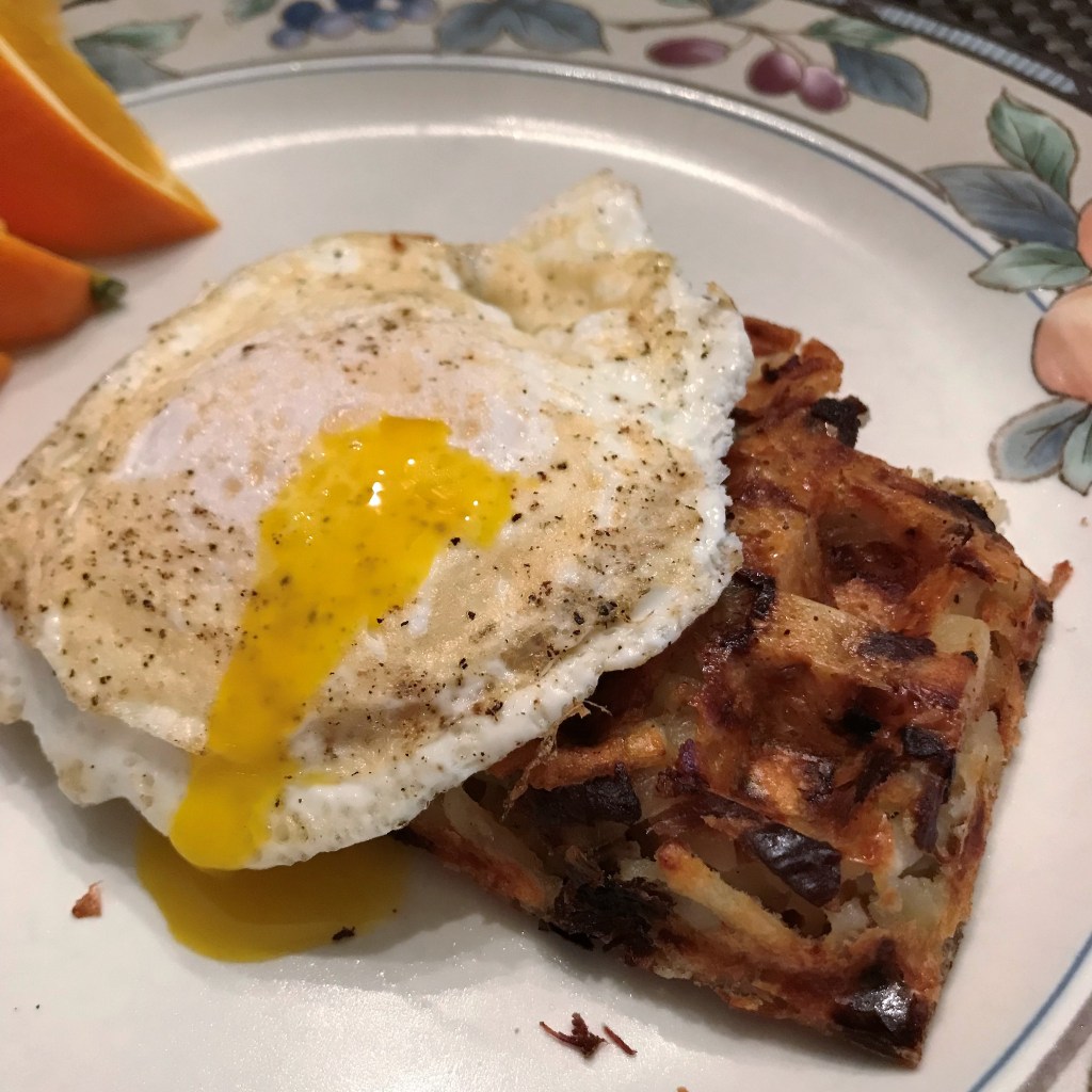 One of our favorites! Cheesy onion hash brown waffles with egg. I’ll share this recipe during September.