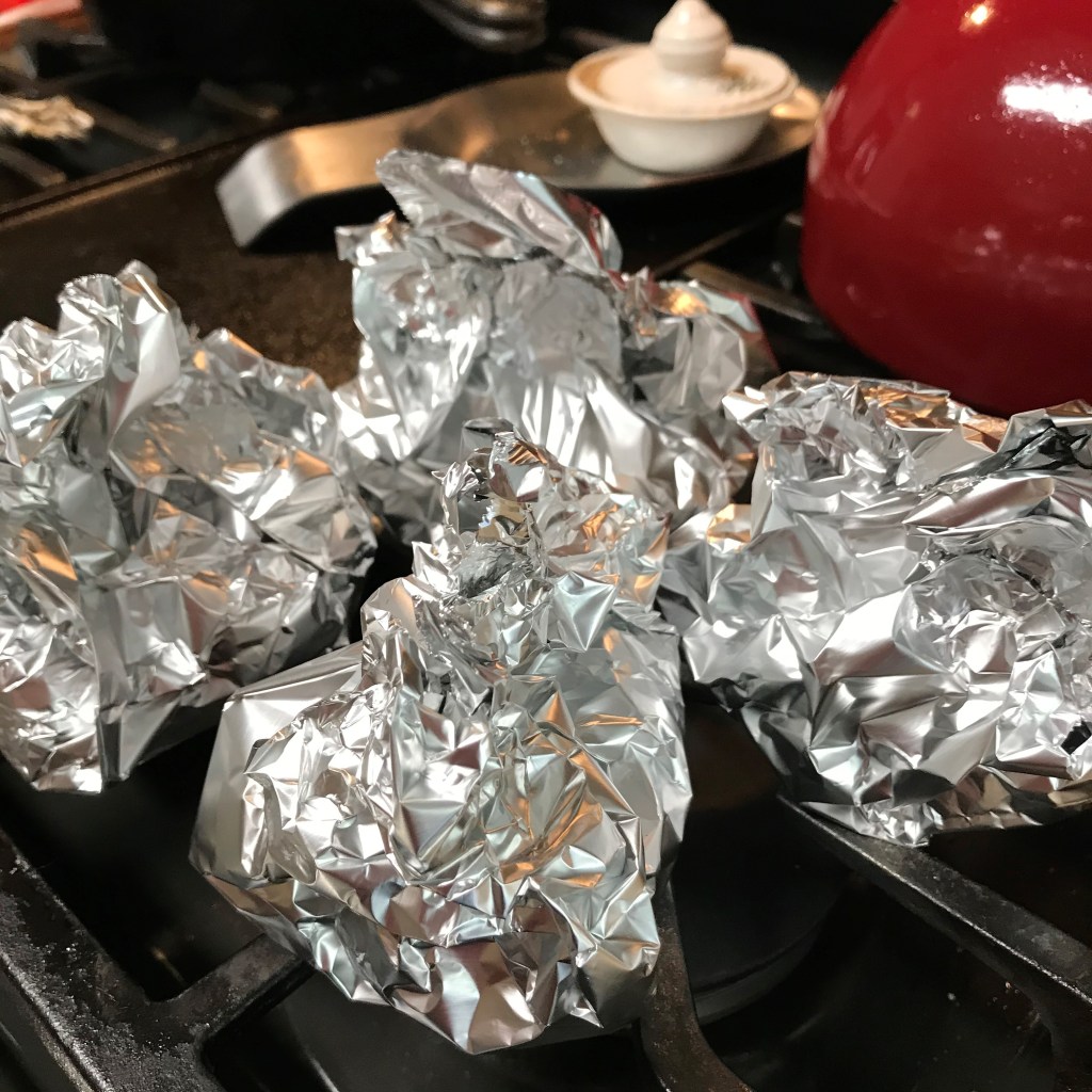 - Place the cloves (individually or two at a time) on a square of aluminum foil, and wrap the foil up the sides to create a bundle, but leave it open at the top. Drizzle or spray oil lightly over the exposed tops of the cloves.