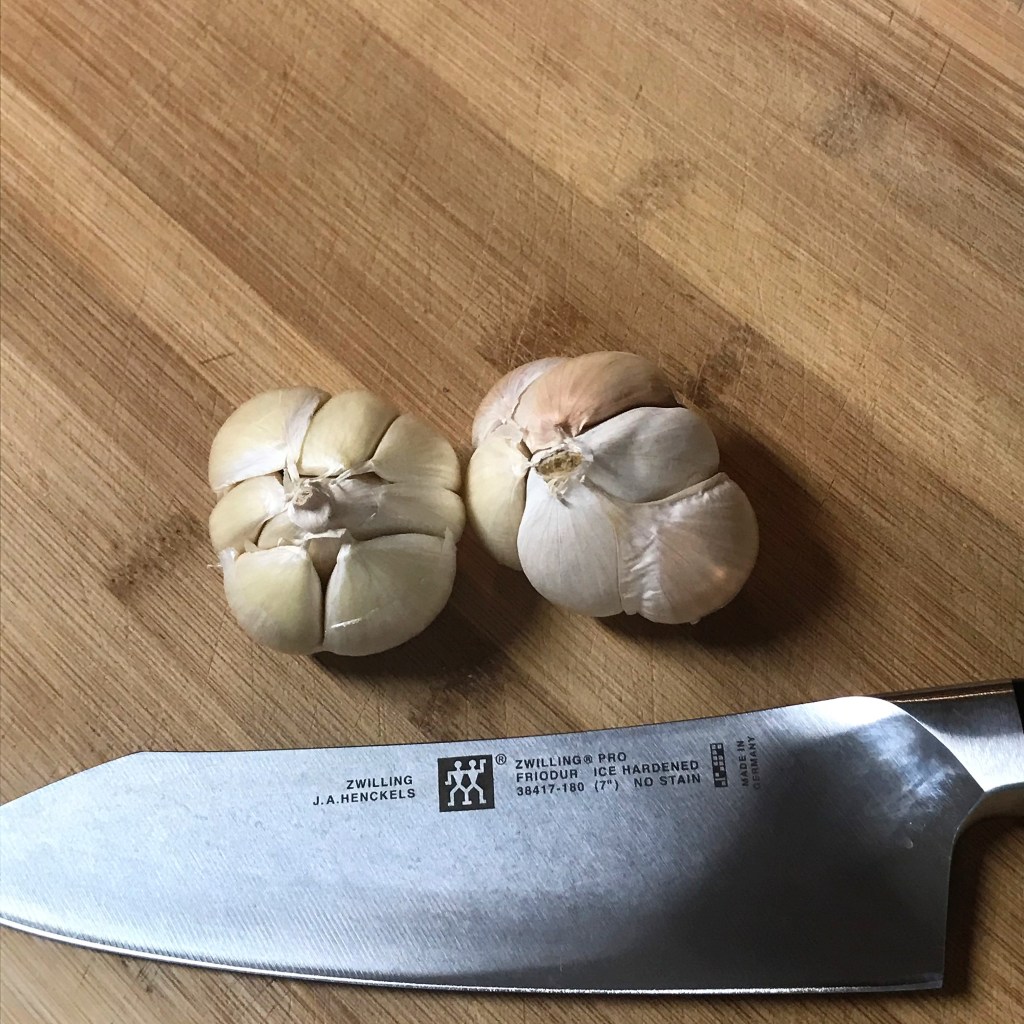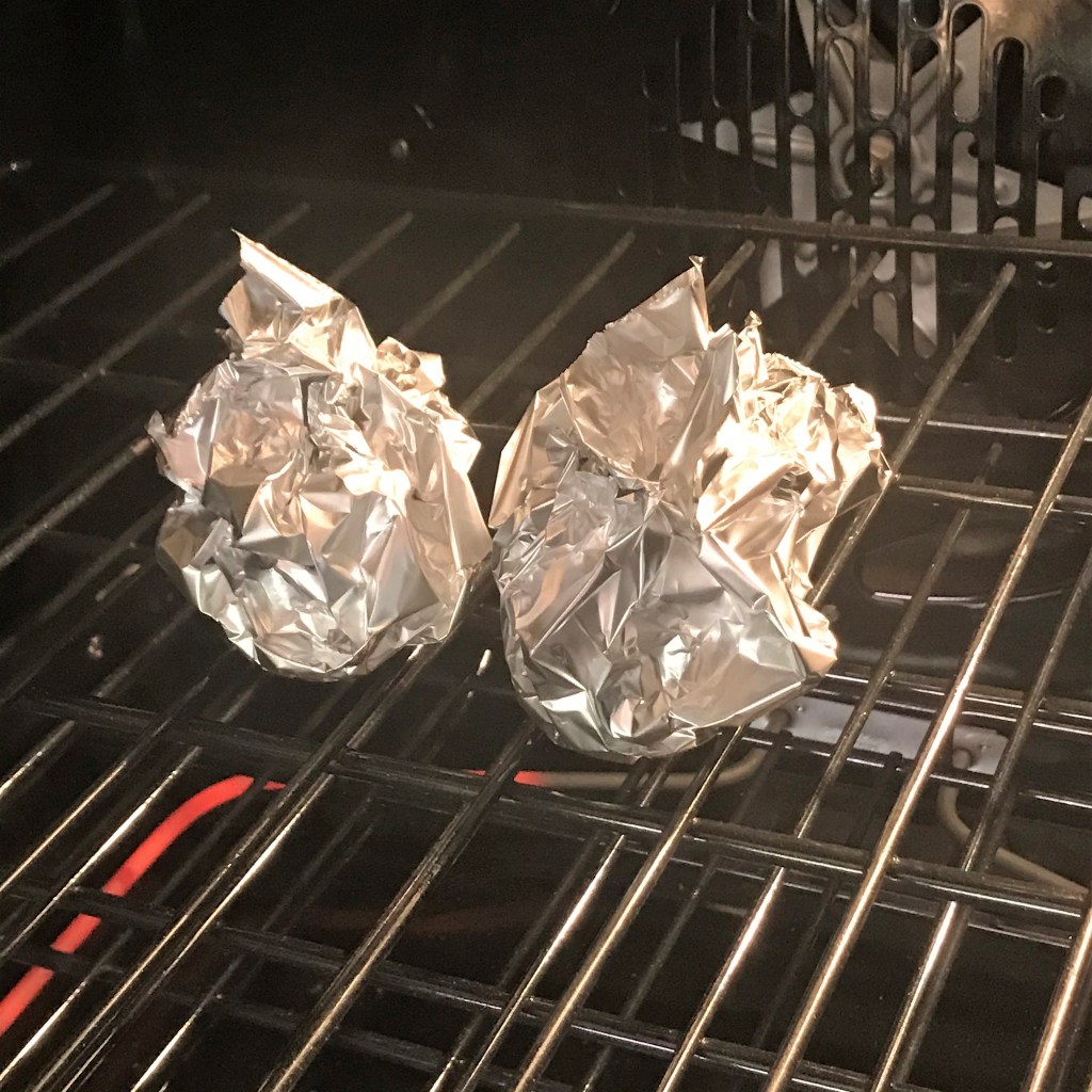 Preheat oven to 350° F. Roast the head of garlic by cutting off the top, adding oil (olive oil preferred) either from a bottle or a spray can. Wrap tightly in foil and roast for about an hour. You can check out Terrie’s post from yesterday for more detail and step-by-step pictures, but it goes like this: