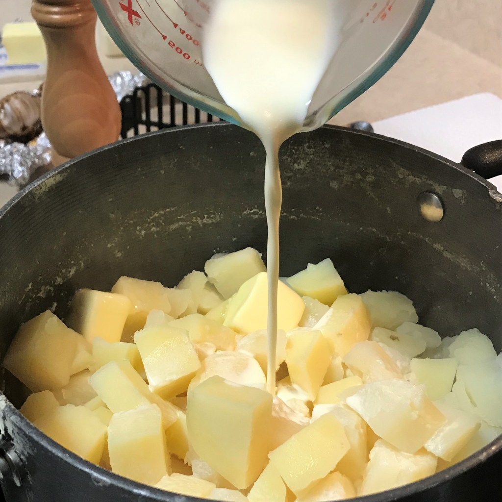 I can’t remember exactly when I ditched boxes of potato flakes and started making mashed potatoes the real way for Thanksgiving (and every other time I wanted mashed potatoes). But I can say the process has evolved over the years. As my wife, Terrie, creator of this blog often says, cooking is about being inspired, taking chances and elevating your dishes. Just as I continue to try new methods and ingredients on the first dish I ever successfully created (chili), I’ve tweaked these garlic mashed potatoes over the past 20 years. In fact, they didn’t even start out as garlic mashed!