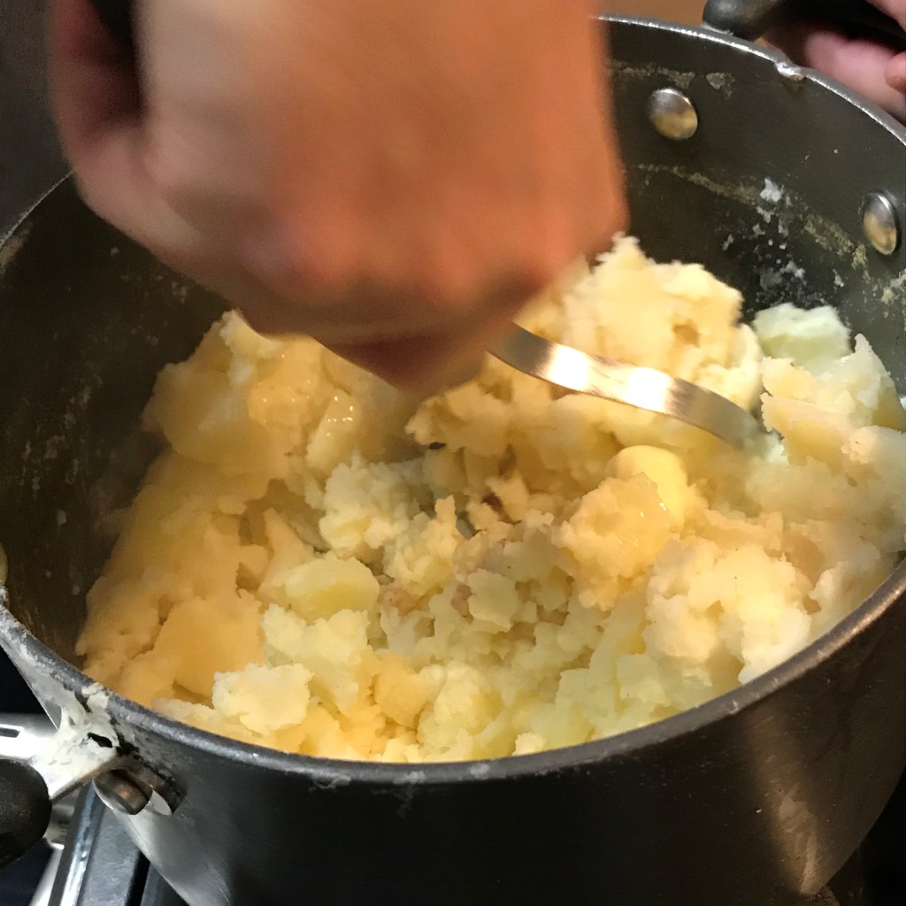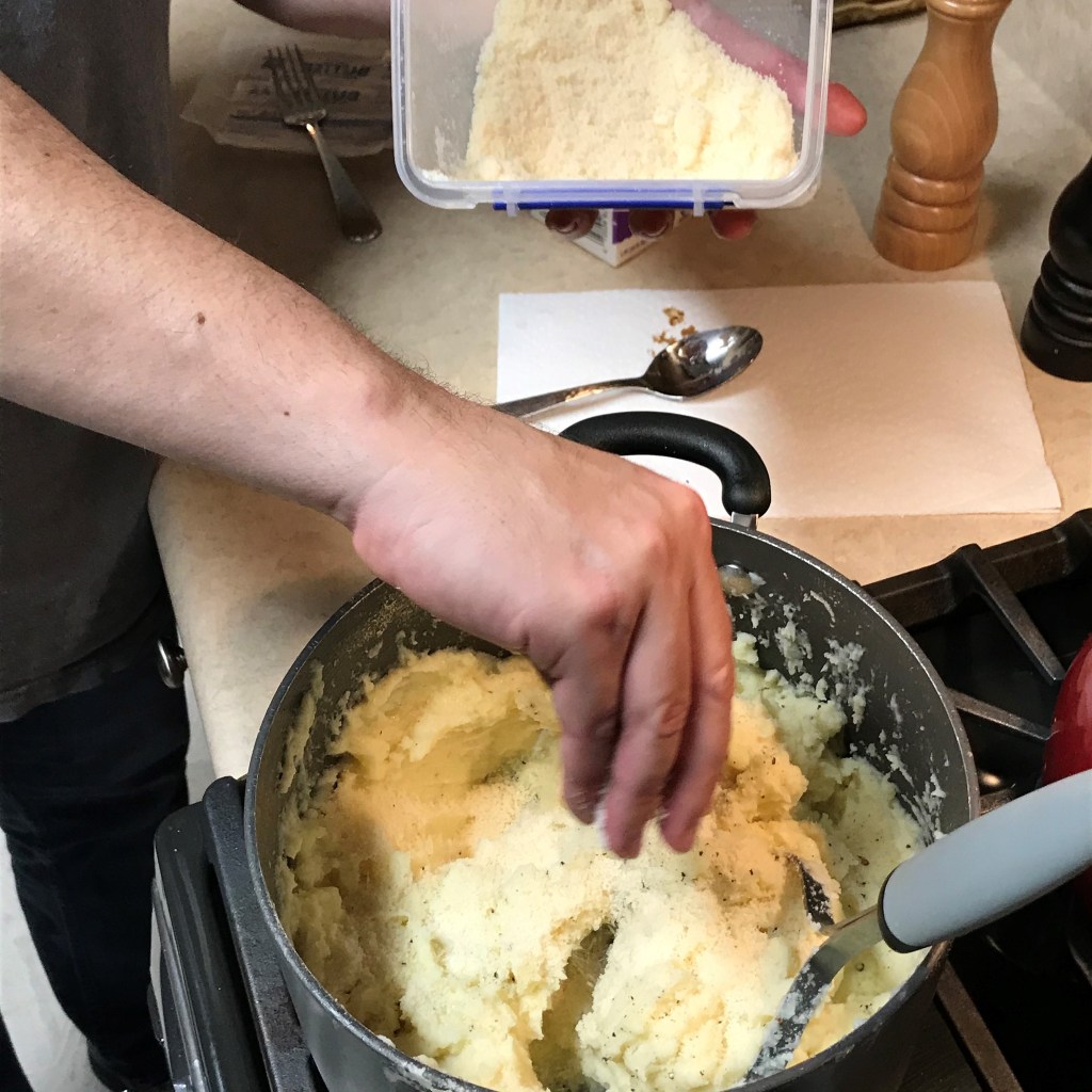 As you mix, continue to taste, adding salt and pepper as needed, but also adding additional butter and/or cream if it feels too potato-ey. Add the grated cheese blend and continue to mash until it completely disappears into the mix, which won’t take long.