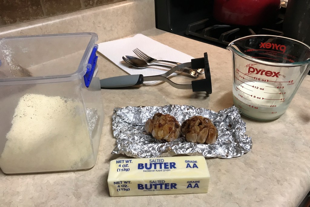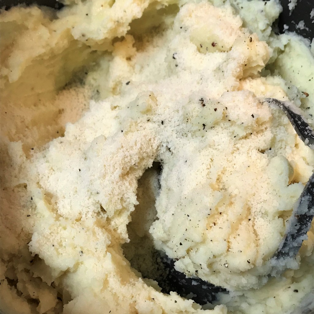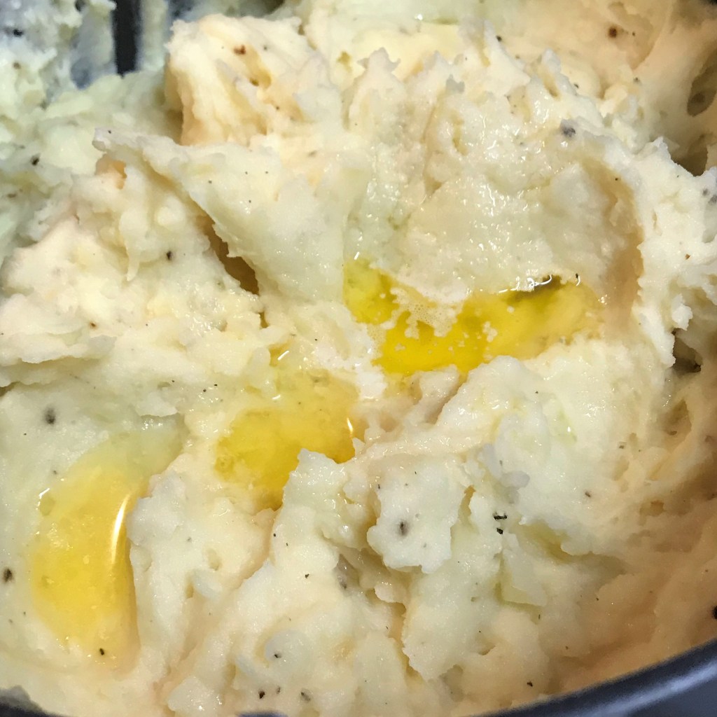 For the current version, I’ve upped the ante by adding real butter, roasted garlic, our grated parm-romano blend and heavy cream, none of which were in the early year versions of this dish. About a decade ago, I decided to experiment with the potato mix. I loved Yukon Gold and had a hunch doing a 50-50 mix of Yukon and russet would work well. I was right. The garlic mashed I’m serving up here is a silky blend of flavor that kind of melts in your mouth. I usually add more butter than what the recipe calls for. Just because, as Terrie and I say about certain recipes, “There’s too much butter (or parm-romano blend, bacon, bourbon, chocolate). Said nobody. Ever.”
