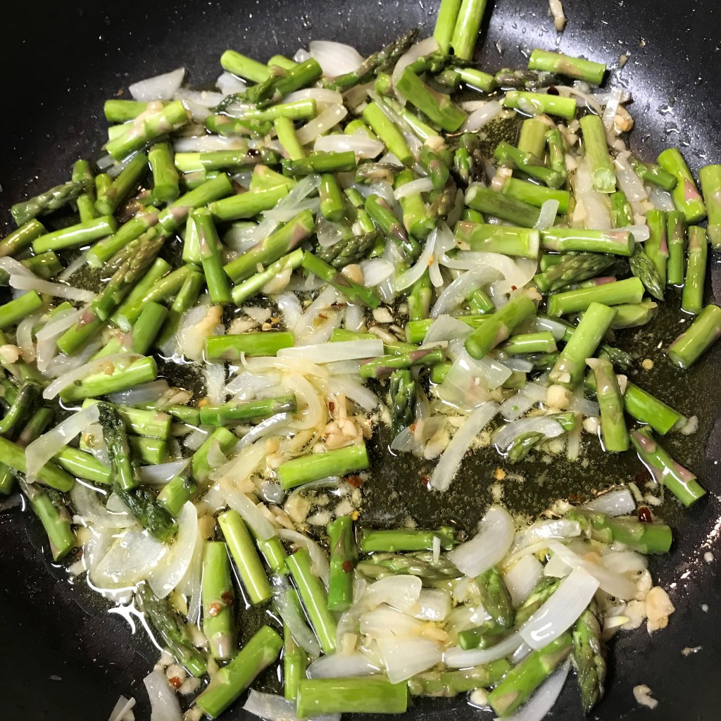 - After the garlic has poached about 20 minutes, turn the skillet heat up to medium. When oil begins to bubble around the garlic, add the onions and asparagus and sauté 5 to 7 minutes, until the onions are translucent and the asparagus is slightly softened but still bright green.