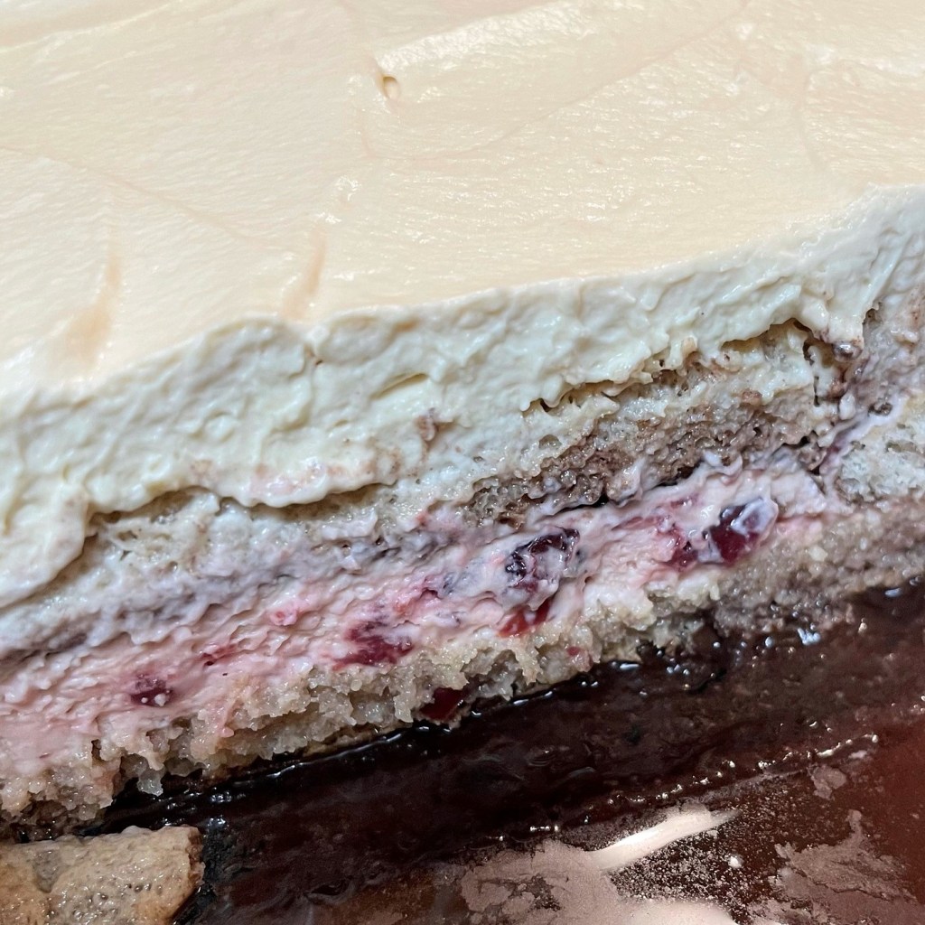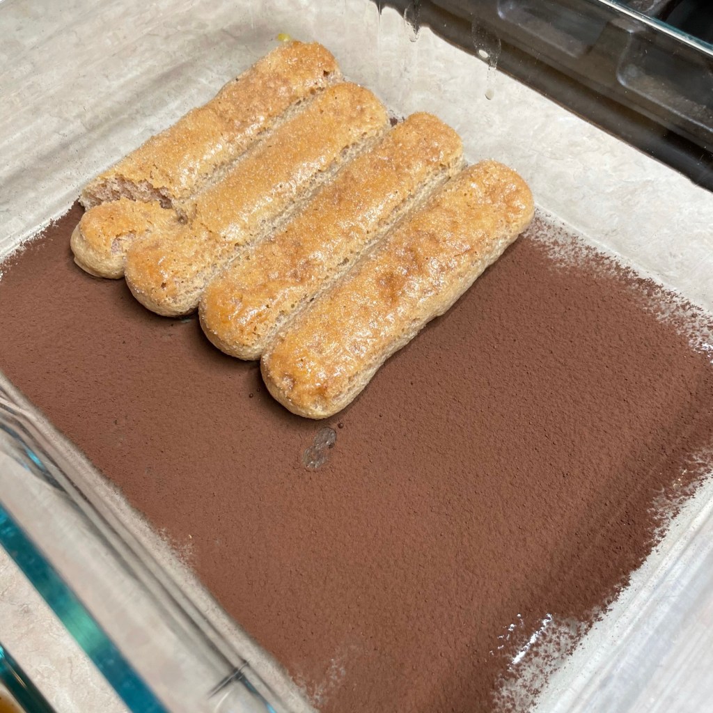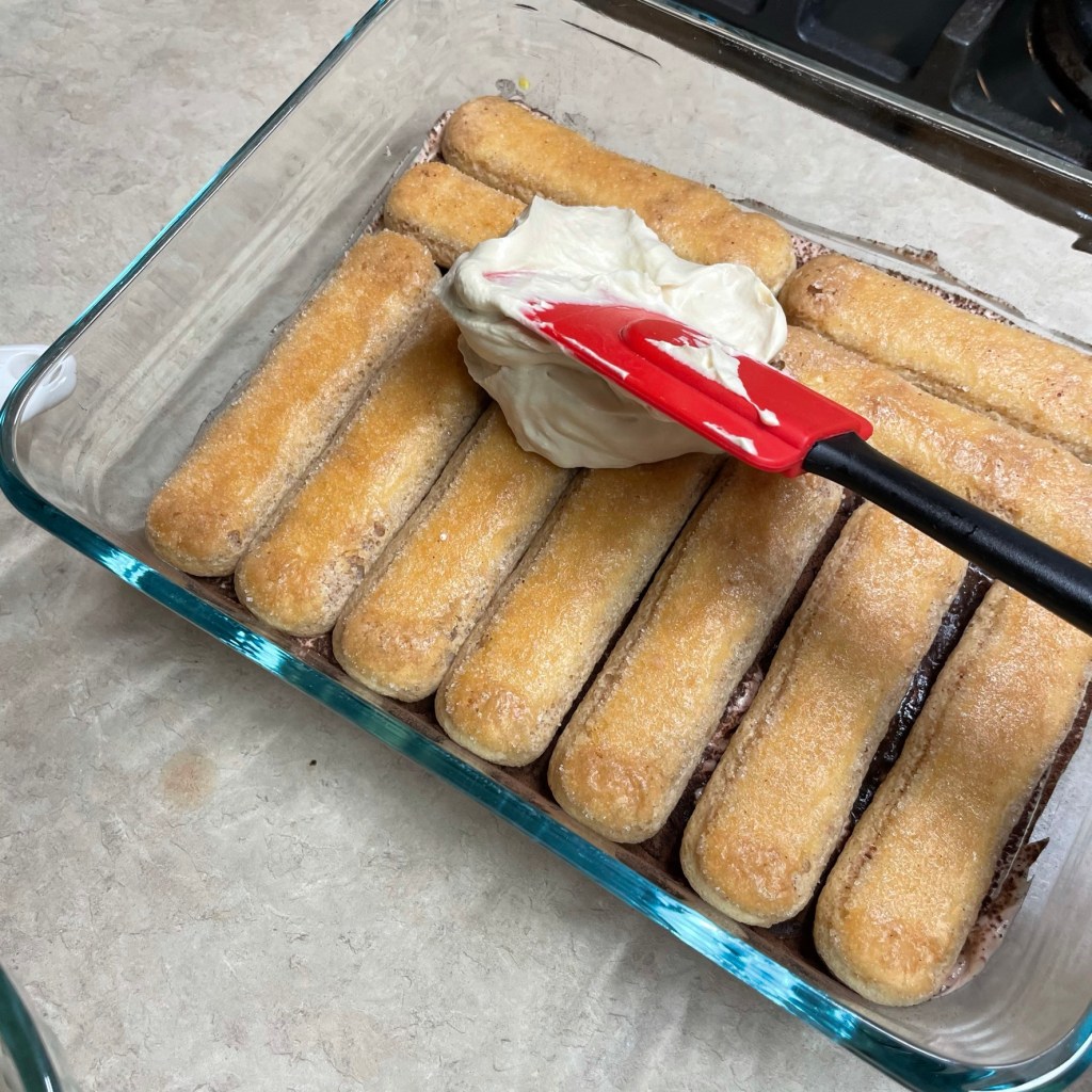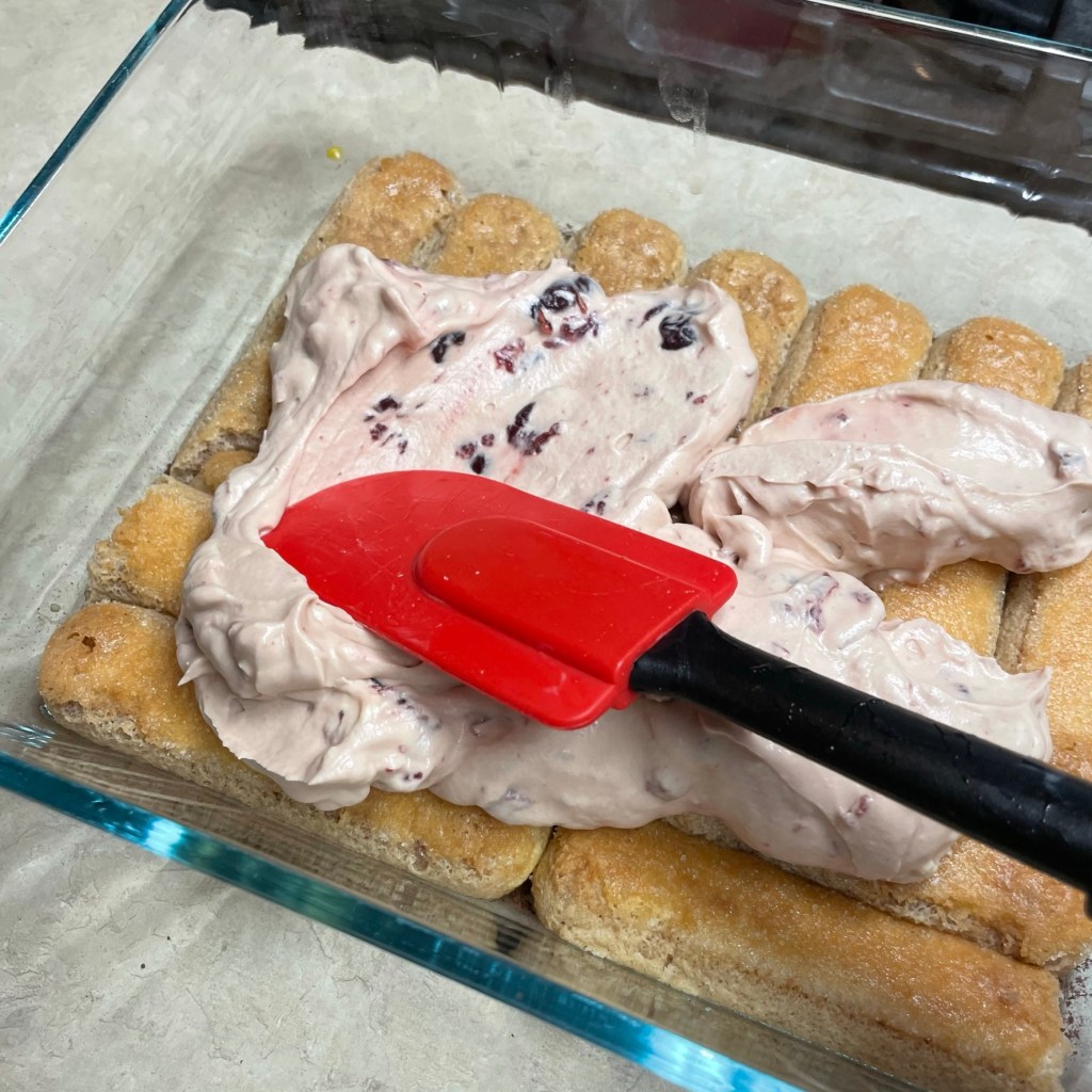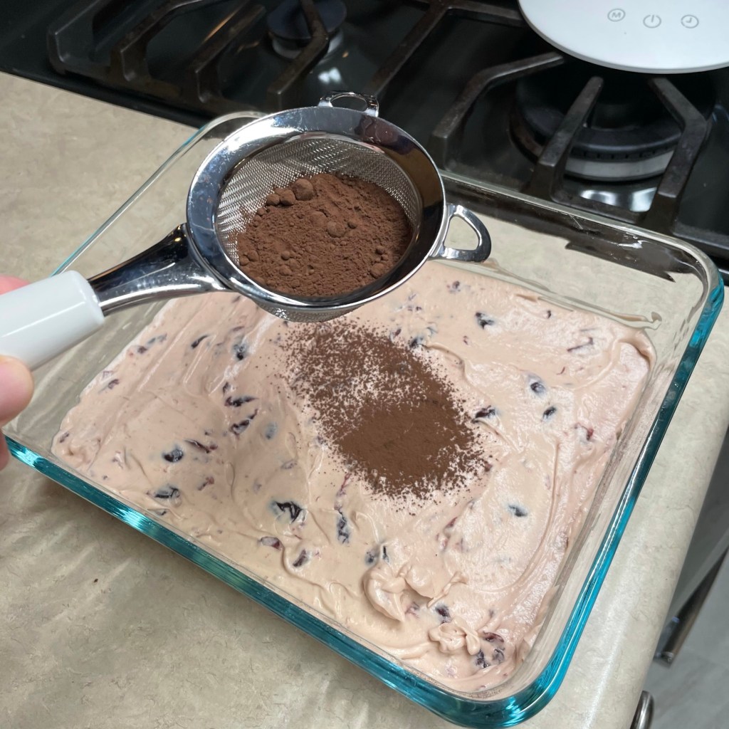 - Spread the cherry-infused mascarpone mixture evenly over the ladyfingers, to the edges of the dish, and then sift cocoa over the layer.