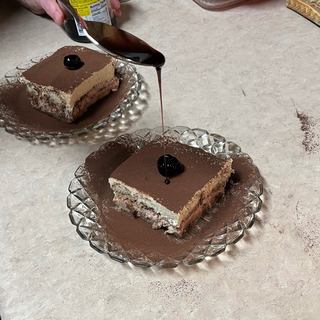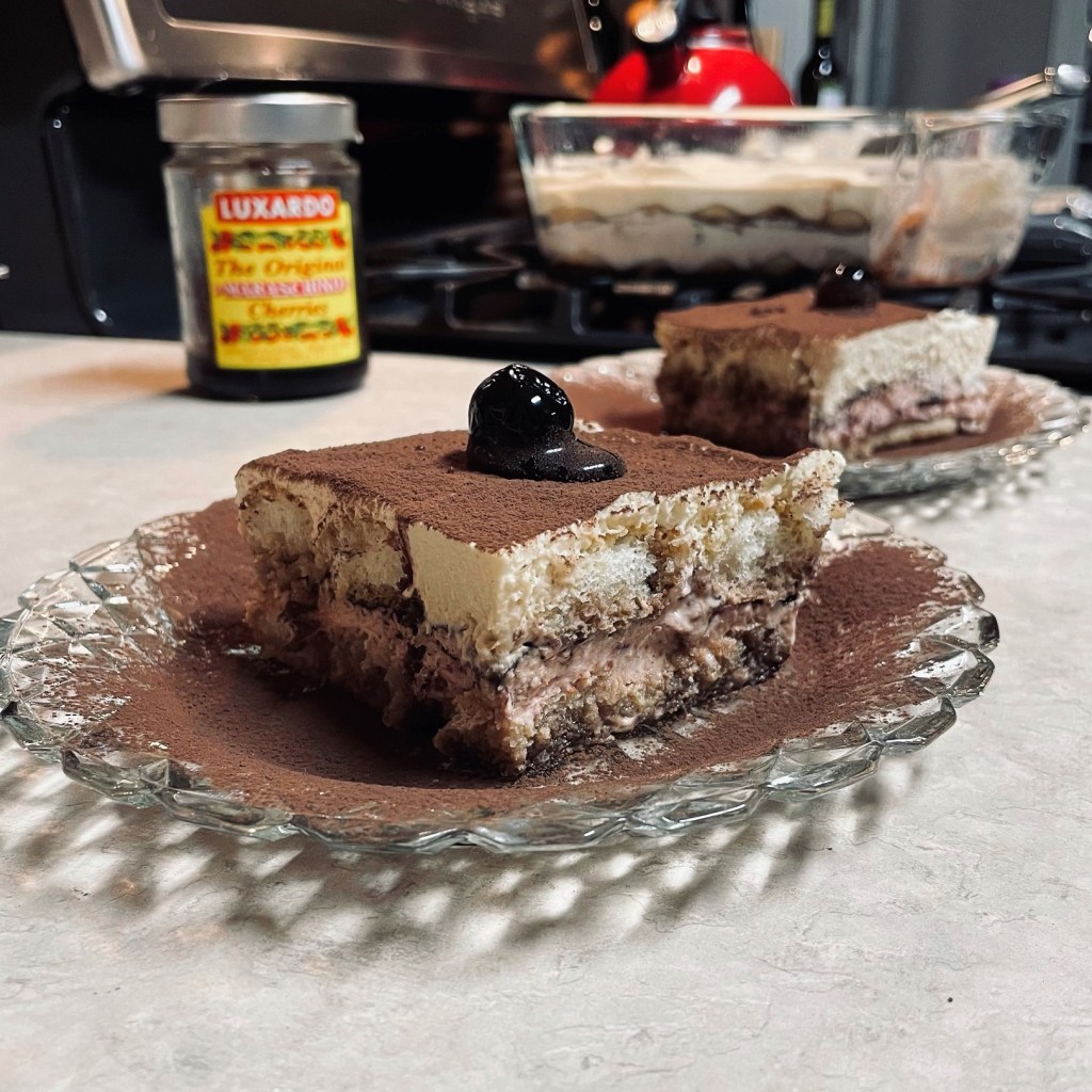 - At serving time, cut tiramisu into squares. Sift additional cocoa over the top of each serving and finish with a Luxardo cherry garnish.