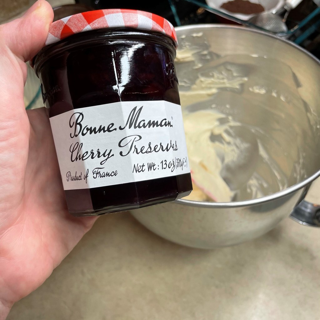 I made a midstream decision to fold cherry preserves into part of the mascarpone mixture, given that Valentine’s Day was already a chocolate-and-cherry kind of day. This brand is delicious, but a similar thick fruit spread would also work.