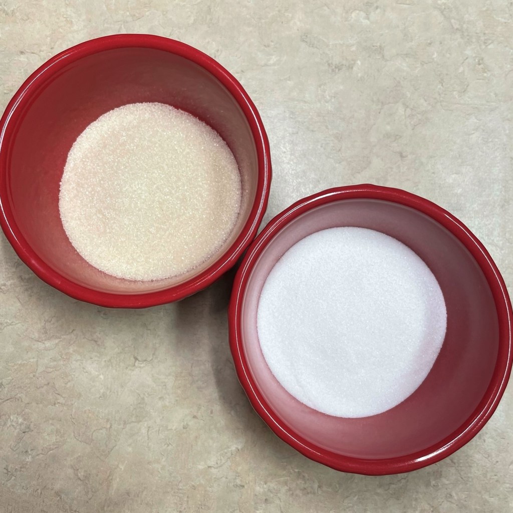 The caster sugar (on right) is more refined and easily dissolved, compared to regular cane sugar.