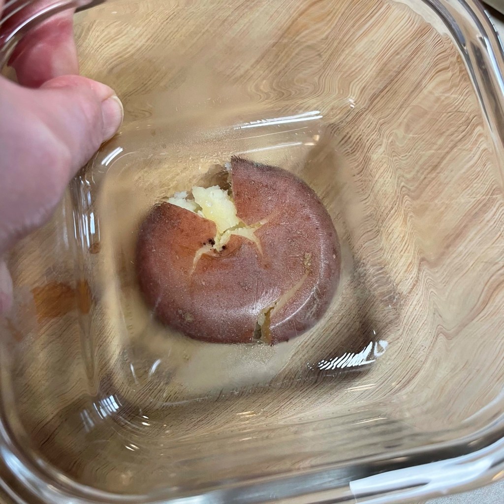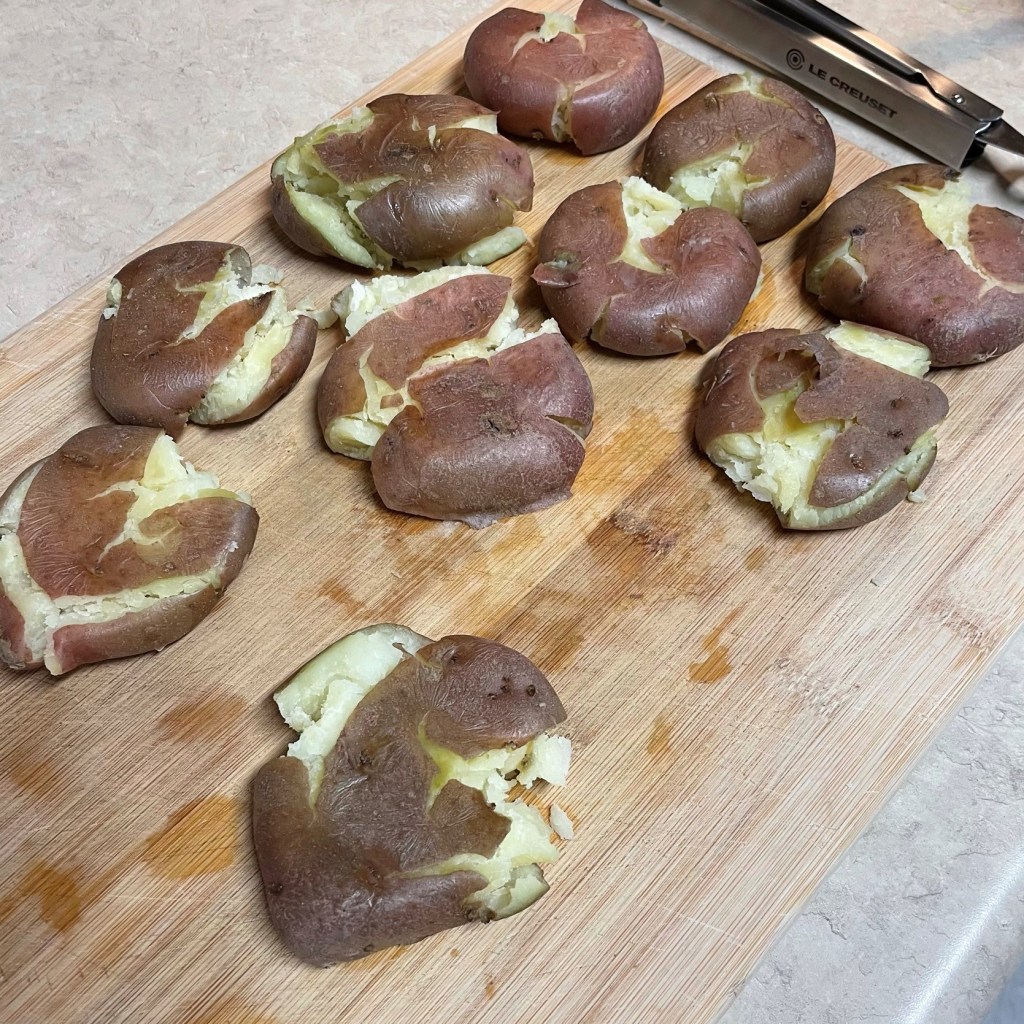 3. Place one potato at a time on a cutting board and press it gently, using a flat-bottomed dish or bowl. Use a clear bowl if possible, to help you see how much the potato is flattening. It should burst slightly open on the sides, but you want to keep it intact as much as possible. Easy does it. After flattening, each potato should be about 1/2 inch thick.