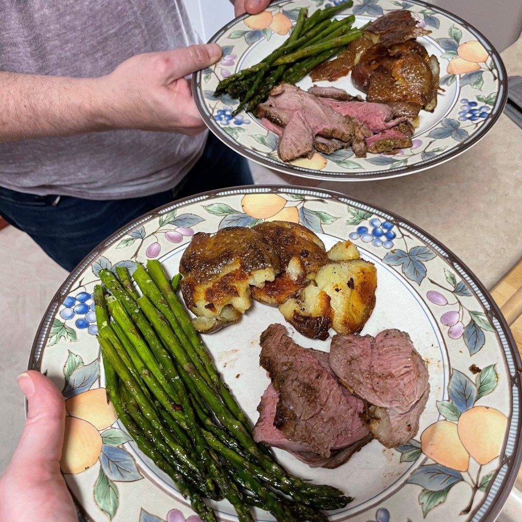 These crispy, pan-fried potatoes are easy and done in the background while you work on whatever else you’re serving for dinner. We had them this time with our Easter dinner of roasted leg of lamb and asparagus. But wouldn’t they be great alongside a roast chicken, or meatloaf, or burgers, or just about anything?