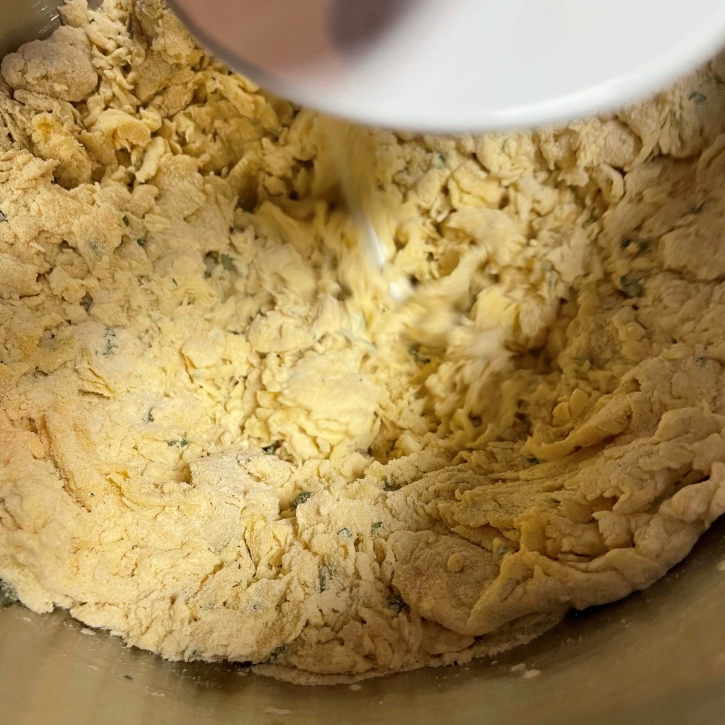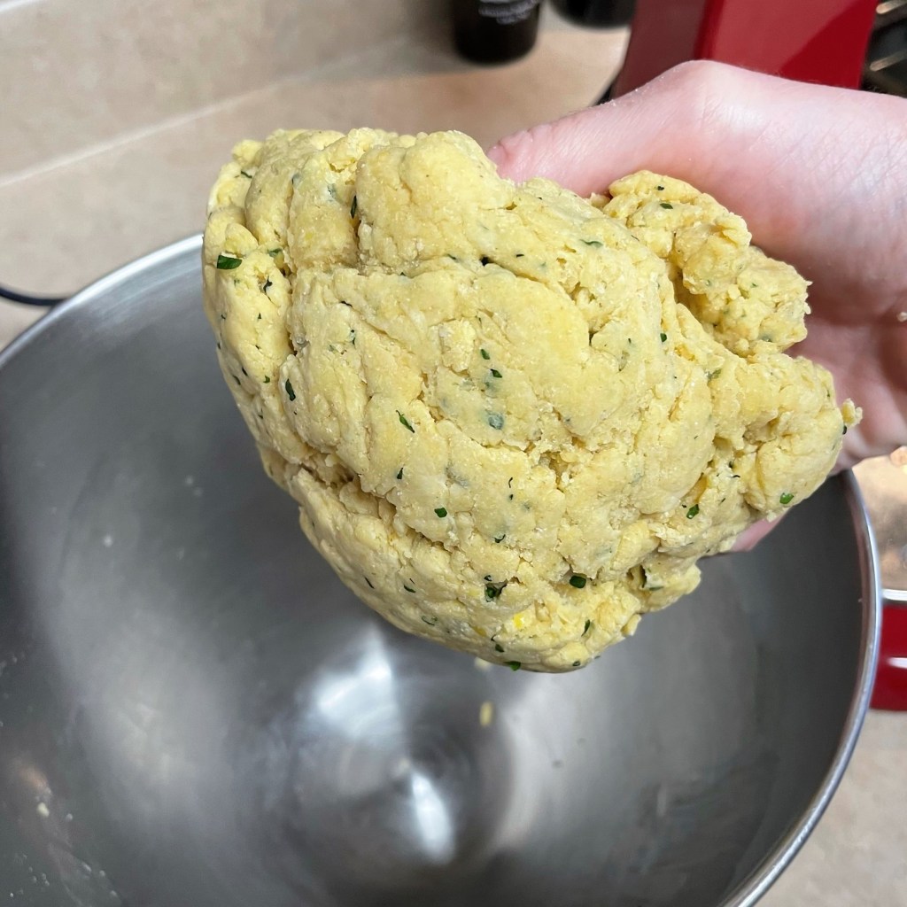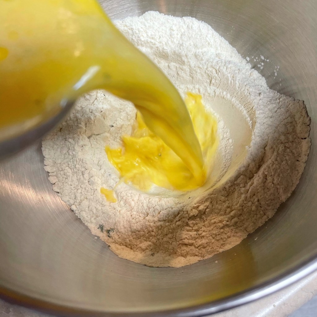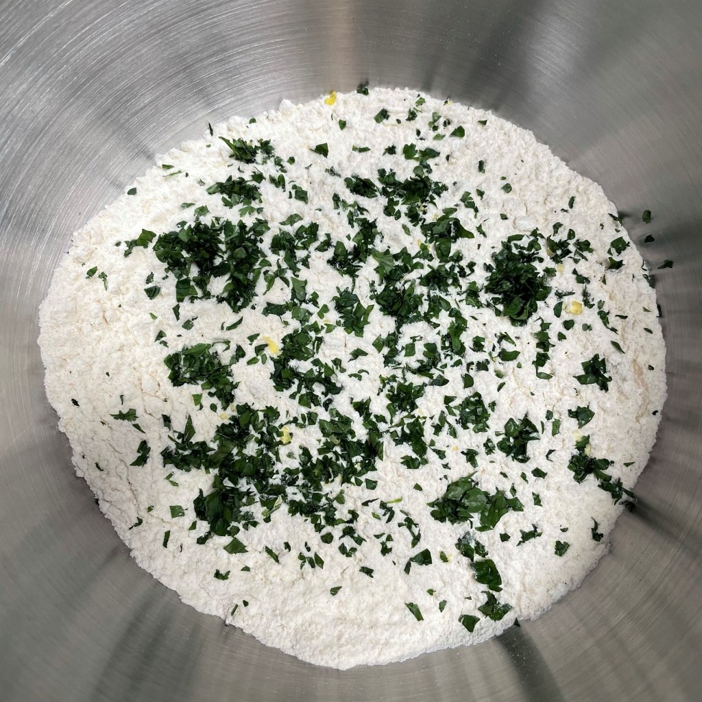 2. Combine flours, salt, lemon zest and lightly dried herbs in the bowl of a stand mixer.