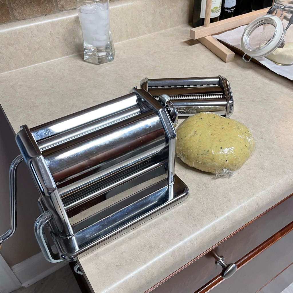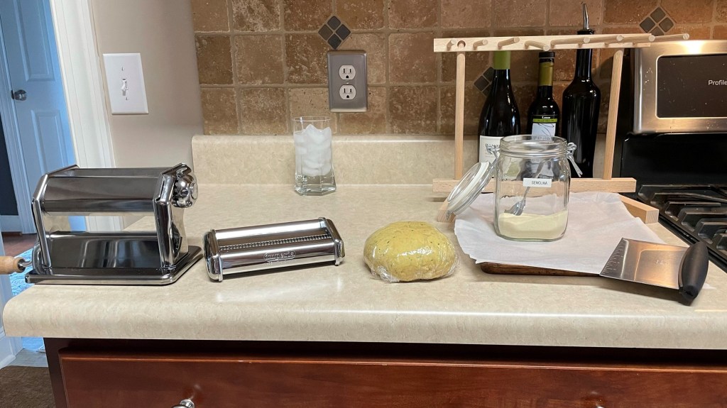Here’s my work station for rolling pasta dough. My machine is clamped onto the edge of the counter, my cookie sheet and drying rack are ready, and my chilled dough is resting at room temperature.