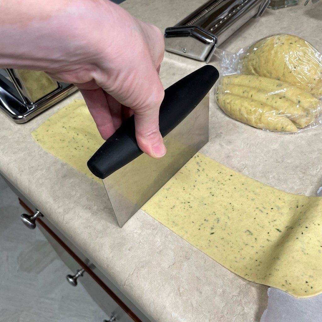 1. Unwrap the pasta dough and use a bench scraper or sharp knife to slice off sections of dough about one inch thick. Keep remaining dough tightly wrapped until ready to roll, so it doesn’t dry out.