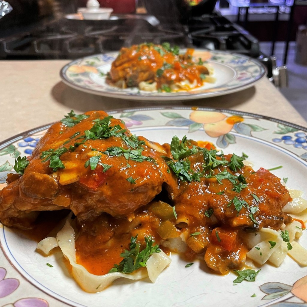 We used the lemon-herb pasta in a couple of ways—first, with littleneck clams in white wine broth, and again as a base for an amazing dish of chicken thighs in vodka sauce that Les made for us.