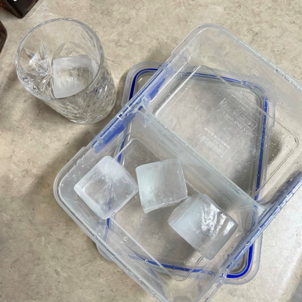 Strain the cocktail into a double rocks glass, over a big, fat ice cube.