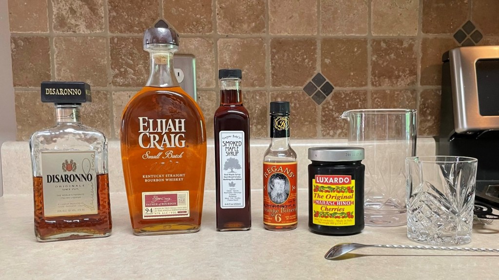 Combine the bourbon, amaretto and smoked maple syrup in a cocktail mixing glass or shaker. Add drops of bitters and stir to blend. Add about one cup of ice and stir briskly (or shake, if using a shaker) until the outside of the container becomes frosty, which will be about 20 seconds.
