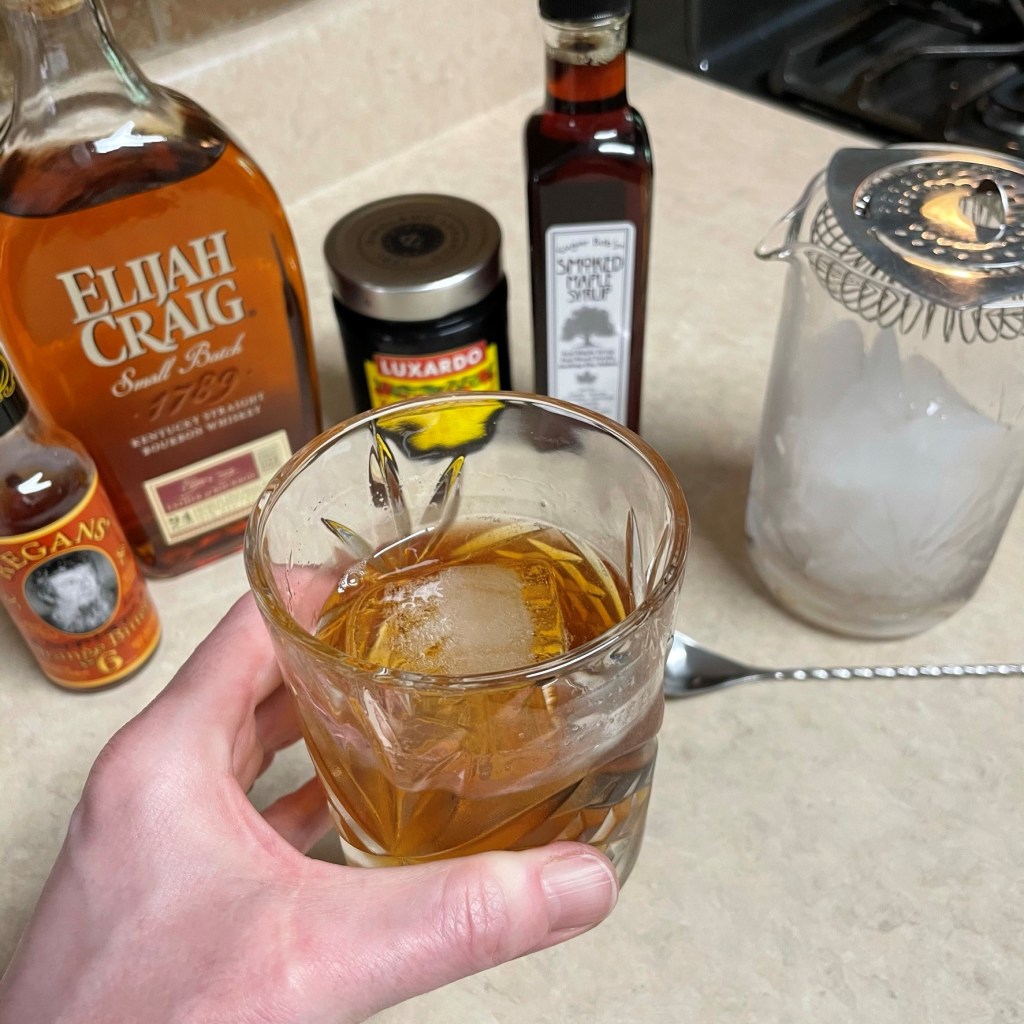 The cocktail part of our Friday night has varied widely over the past year, and you can hit the Happy Hour page to see a few of them. As of late, my go-to has been a dry gin martini and Les usually locks in on bourbon, a spirit he barely even knew before he met me (you’re welcome, babe). Of all the cocktail variations we have tried, we always seem to come home to this smoked maple old fashioned. It is classic in that is relies on smooth bourbon and bitters, but slightly unconventional in its substitution of smoked maple syrup for the standard muddled sugar cube. Our usual garnish is a simple Luxardo cherry, which, in my opinion, should win an award for “best cherry ever created.” But we sometimes go all-in with an orange peel twist, too, and I like the fragrance that lends to the edge of the glass with each sip we savor.