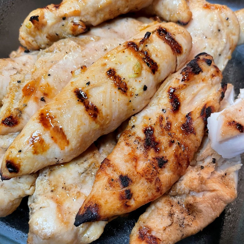 Grill the chicken on a hot grill (500° F at first, my hubby says), then reduce heat to 350° once you get the grill marks. Chicken tenders are smaller than whole breasts, of course, so they will cook more quickly. Watch them closely and pull them off the grill as soon as the juices run clear.