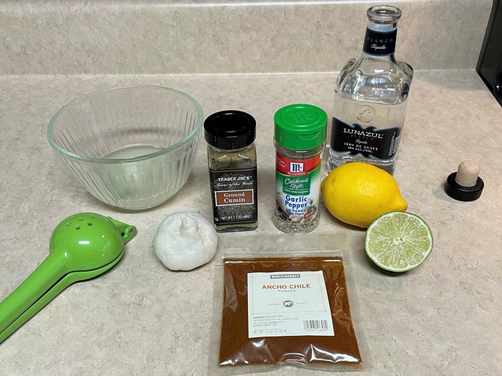 I used spices that were within easy reach in my cabinet, and I chose ancho chile powder because we love the bright, fruity flavor of it. You could just as easily use chipotle powder or any kind of bottled chile powder or, as my friend pointed out in her email, even some kind of pre-made taco seasoning. Keep it simple and southwestern, and let the tequila and lime work their flavor magic.