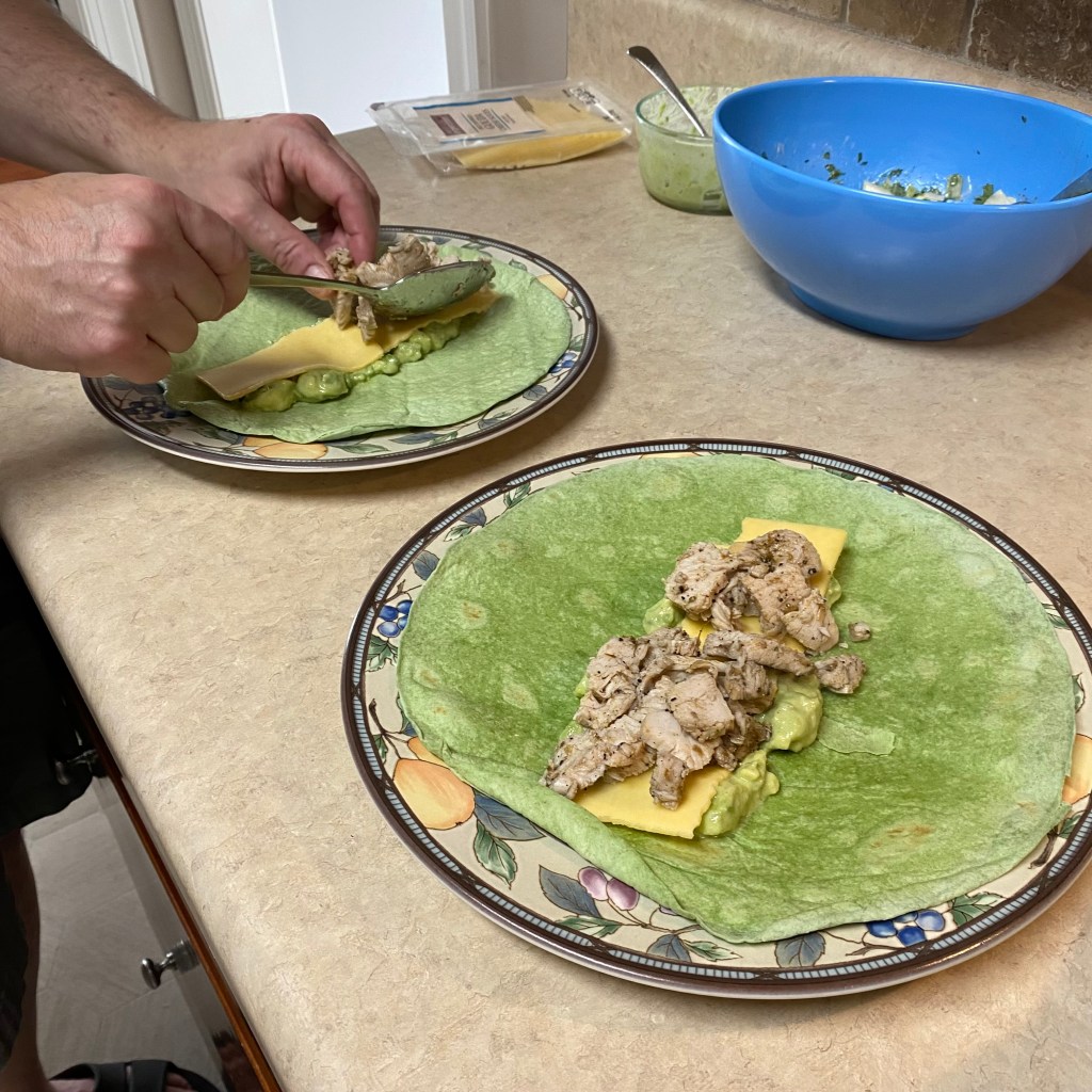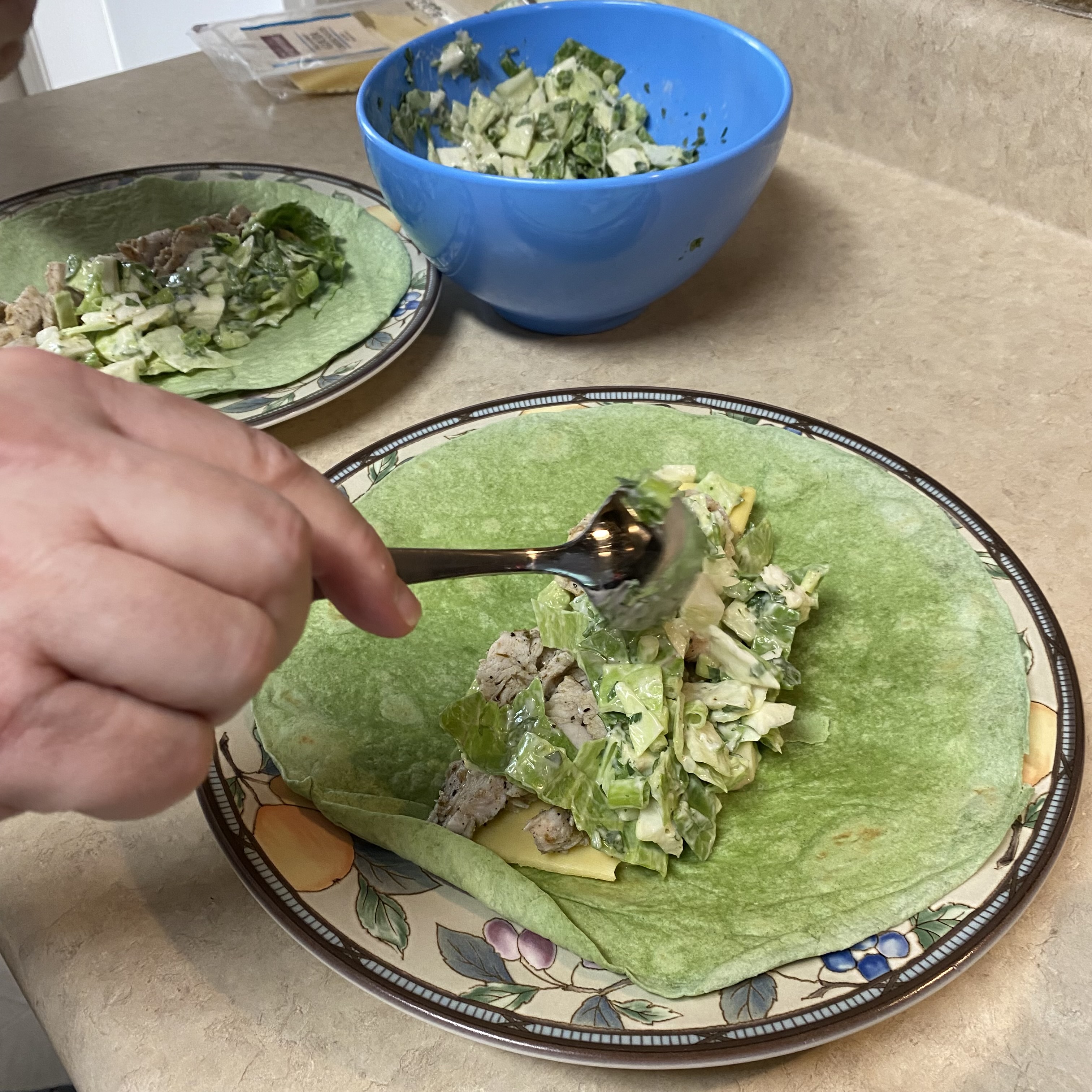 A website called The Wanderlust Kitchen gave me a couple of cool ideas for dressing up my wrap. Its recipe called for a green cabbage slaw and an avocado aioli. I decided not to include a third suggested sauce, a mango chutney, because, to quote one of my mom’s favorite phrases (I love working her into these blog posts despite her cooking shortcomings), “it’s too much, Leslie.” And I ditched the ciabatta the Wanderlust site favored for a spinach wrap because I believed the bread of a ciabatta (or sub roll or similar) would absorb the flavors of the accoutrements. The green cabbage slaw included scallions, another of my basket ingredients, as well as cilantro, which gave a nice bite to the jerk turkey. The avocado aioli, meanwhile, added a tang thanks to its mayo and lime juice. I kept the recipe’s idea of a slice of gouda cheese, but to be honest, the wrap would have worked fine without it.