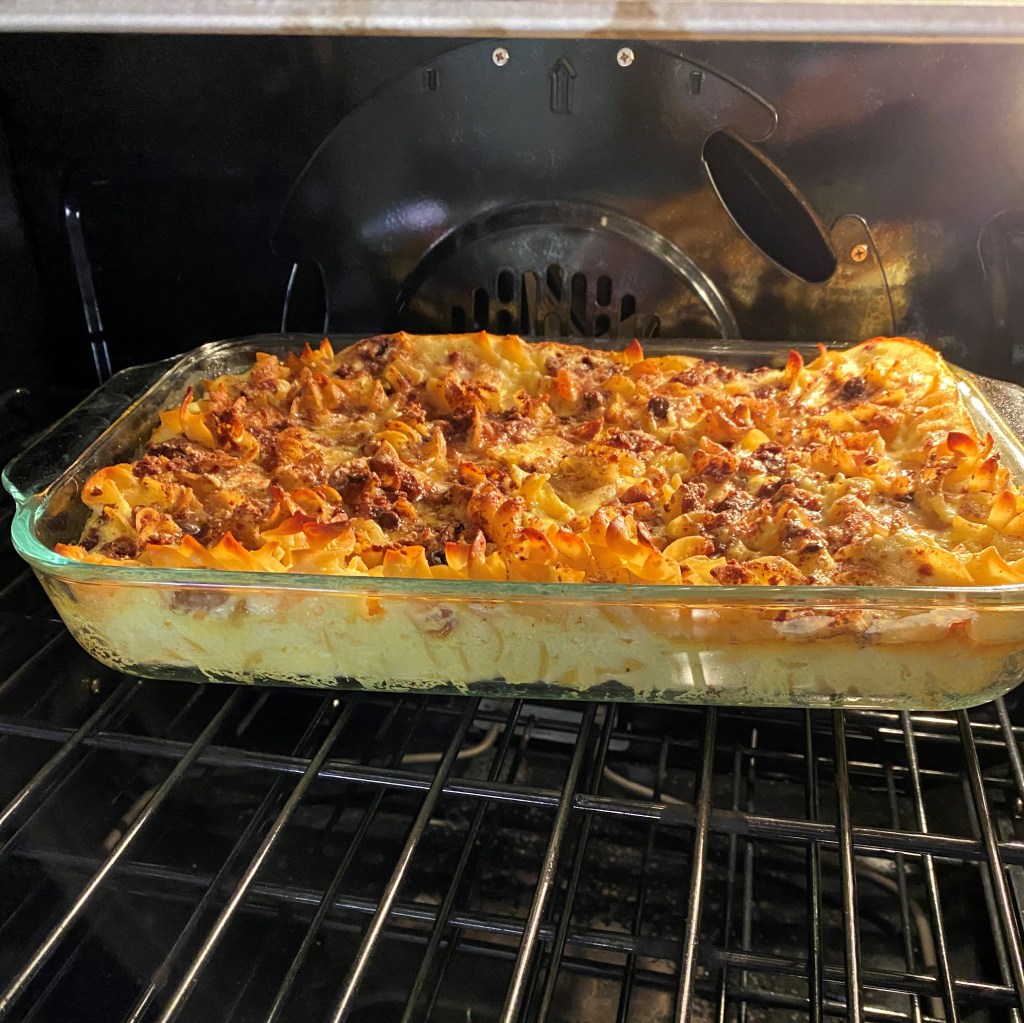 I decided to use Terrie’s go-to chef for Jewish foods—Tori Avey. Tori’s kugel recipe is a classic, using egg noodles (my final basket ingredient), six eggs, sour cream, cottage cheese, cream cheese, butter, sugar, cinnamon and raisins. I had a couple of add-ins for this dish because in one case I messed up and in another, I decided to empty our pantry of another item.