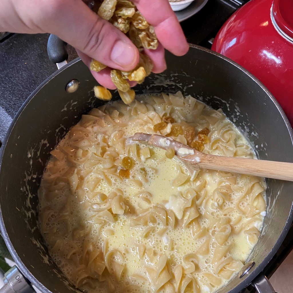 In it goes (after first tasting it to make sure the “use by June 6” stamp hadn’t rendered it foul). The raisins, which first get a warm water bath before being added to the final mix of noodles and wet ingredients, emptied our pantry of another item. As I went to put the casserole in the oven, I had another brainstorm. We’ve had the dregs of a bag of brownie brittle from Costco on our counter for a couple of months; the recipe suggested possible toppings, and although brownie brittle wasn’t one of them, it did suggest anything crunchy (like corn flakes, which we don’t keep in our house). So I crushed what was left of the brownie brittle and sprinkled it on top, along with another dash of sugar and cinnamon. Into the oven went the kugel.