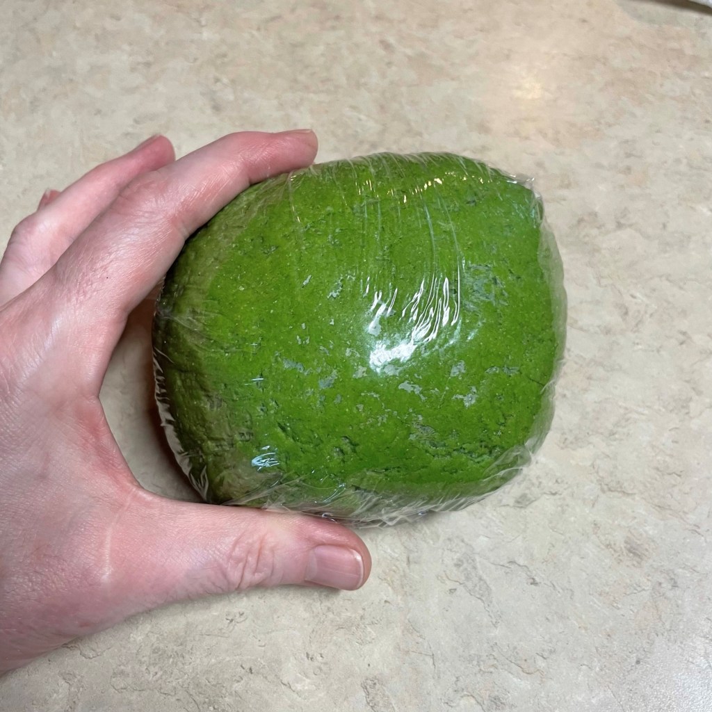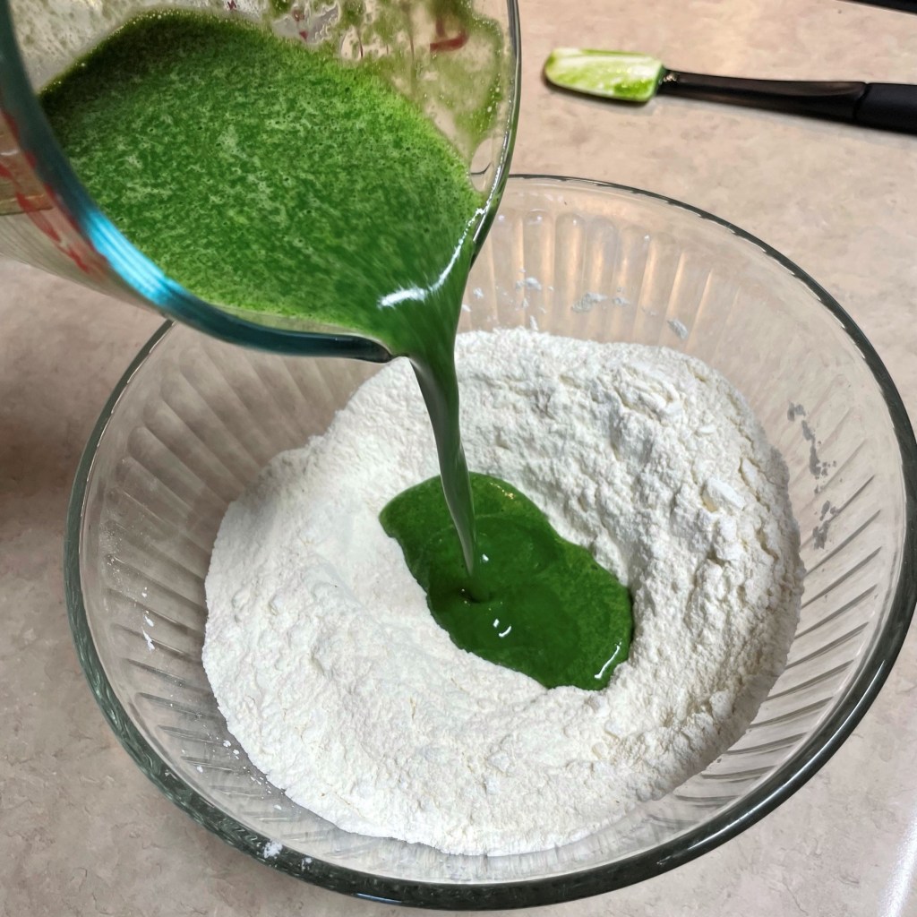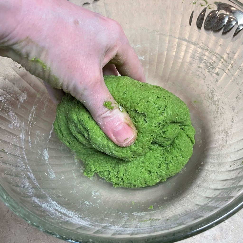 - In a large bowl, stir a generous pinch of salt into the flour and create a well in the center of the flour. Pour in the pureed spinach mixture and mix with a spoon until a clumpy mixture comes together. Knead with your hands in the bowl or turn the dough out onto a countertop and knead several times until all flour is incorporated and no dry spots remain.