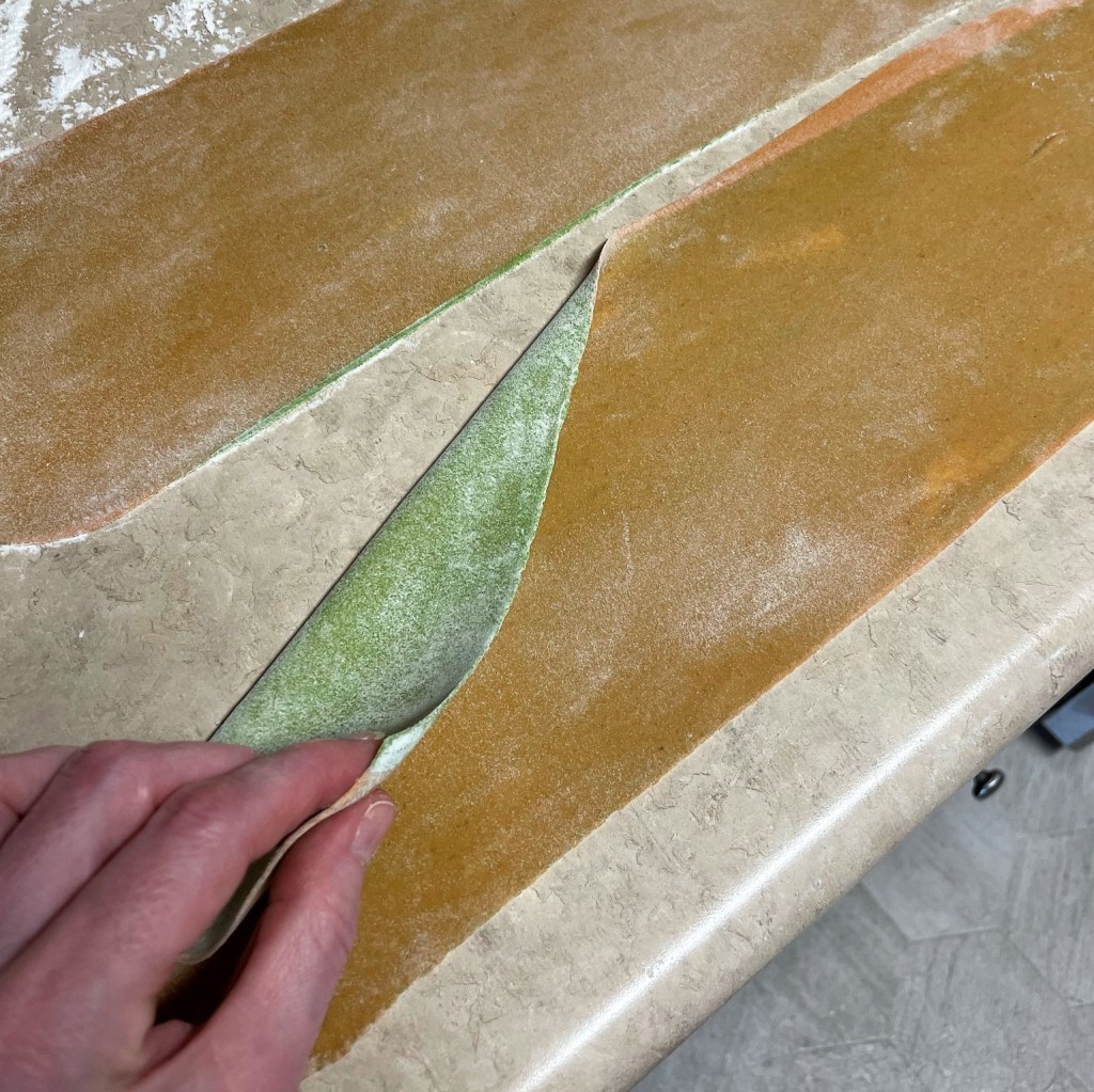 Following Linda Miller Nicholson’s guidance, I sheeted the individual pasta colors, then laminated them together!