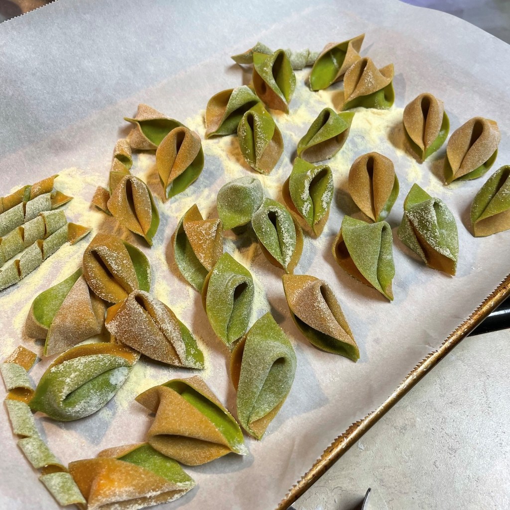 I used mostly semolina dough to make two colors; the orange was pureed sun-dried tomato, and the green was blanched kale.
