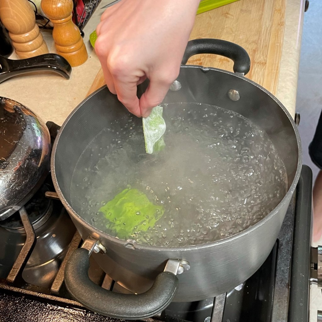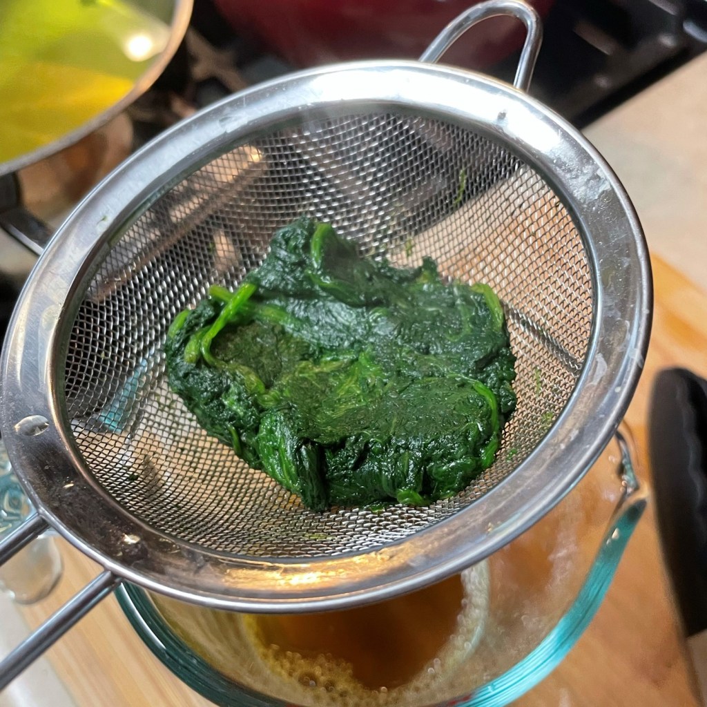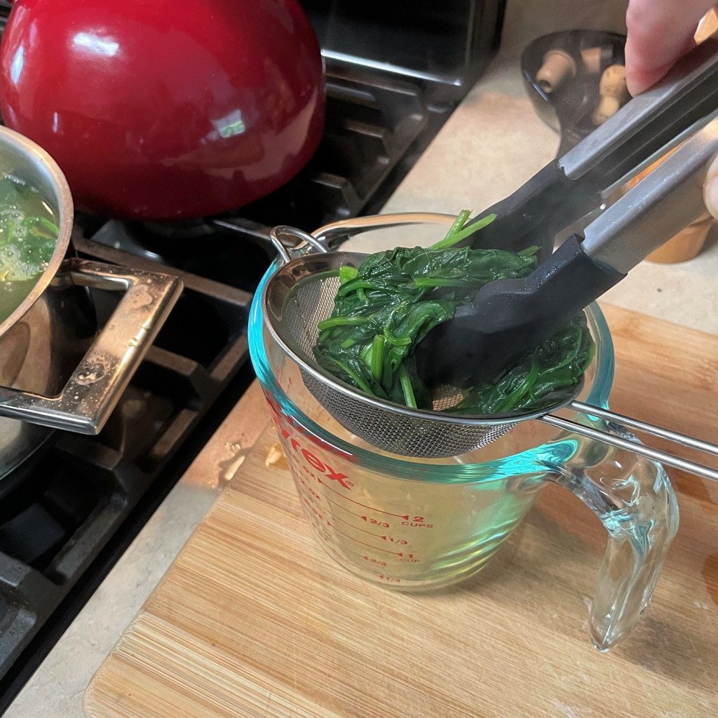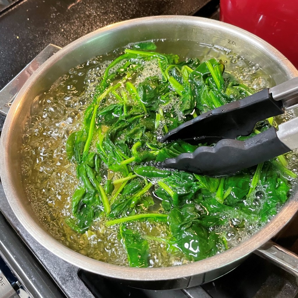 - Bring a pot of water to boil. Add the salt and baking soda and stir briefly to dissolve. Toss in the baby spinach and stir it around for 15 seconds. Use a slotted spoon or tongs to remove the spinach and place it in a mesh strainer to drain excess water.