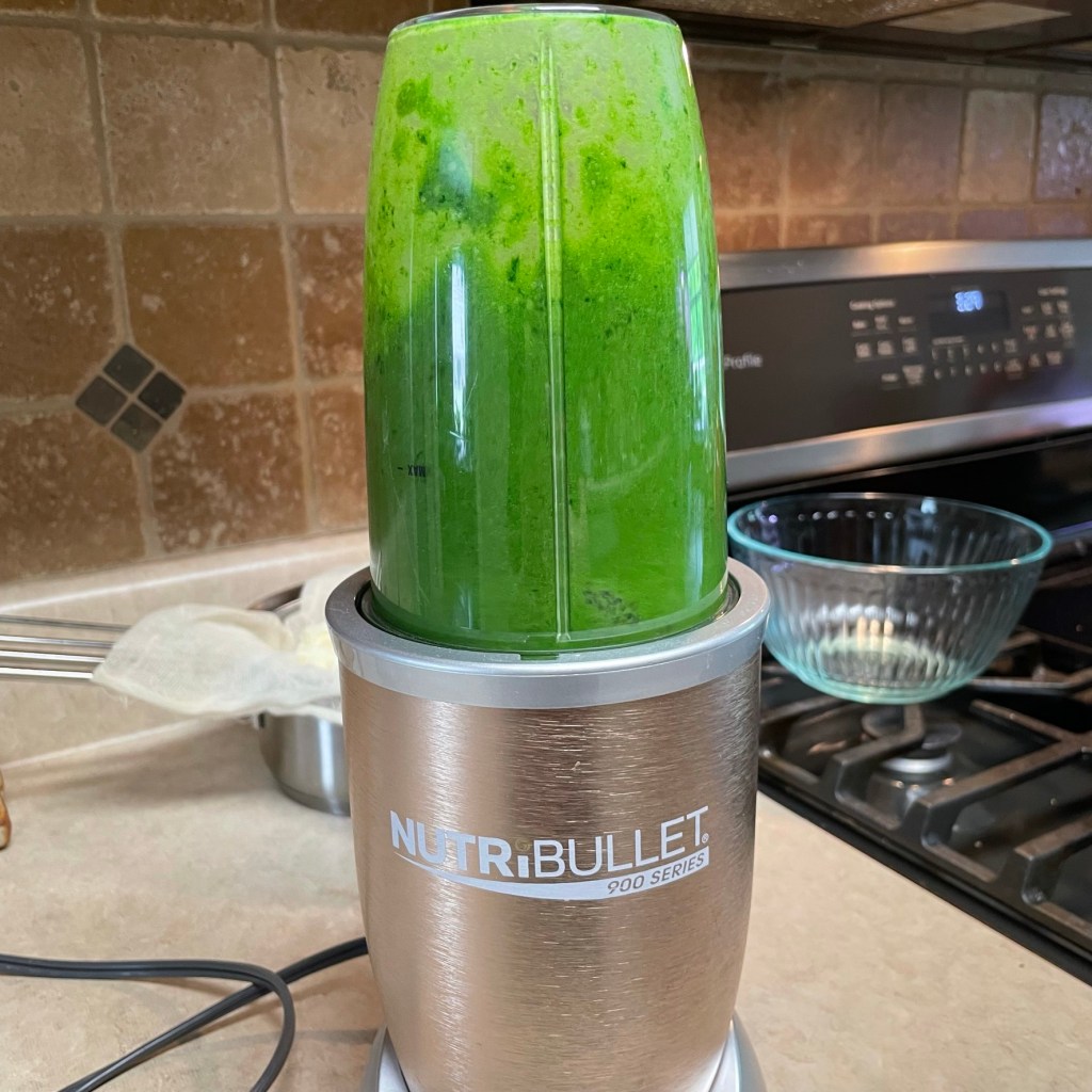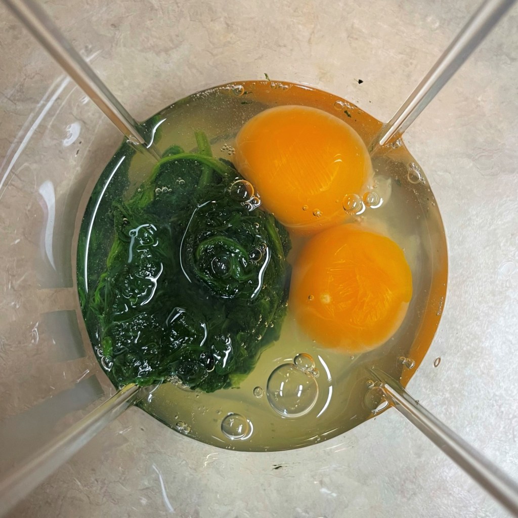 - Transfer the spinach to a regular or bullet blender, together with the eggs. Pulse blend a few times, and then run the blender continuously until the mixture is evenly mixed.