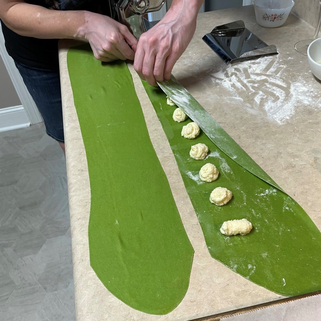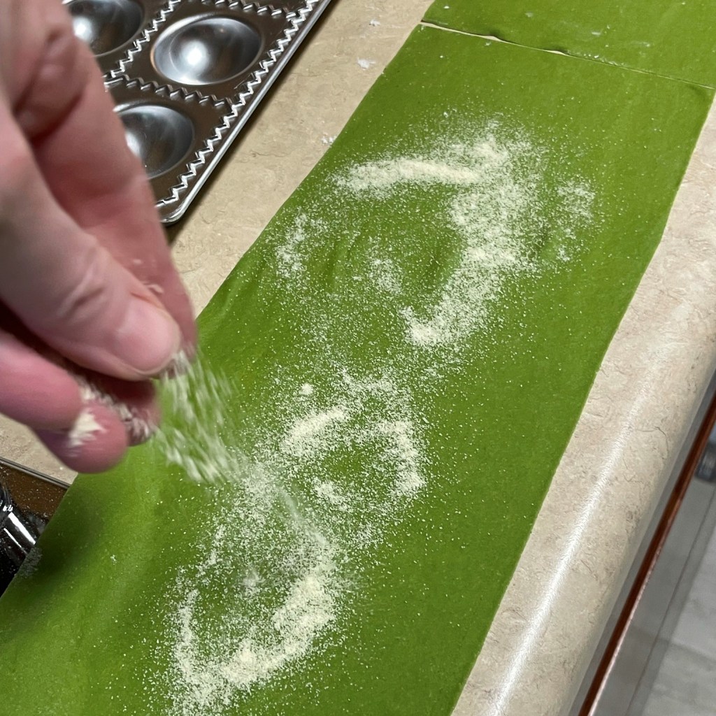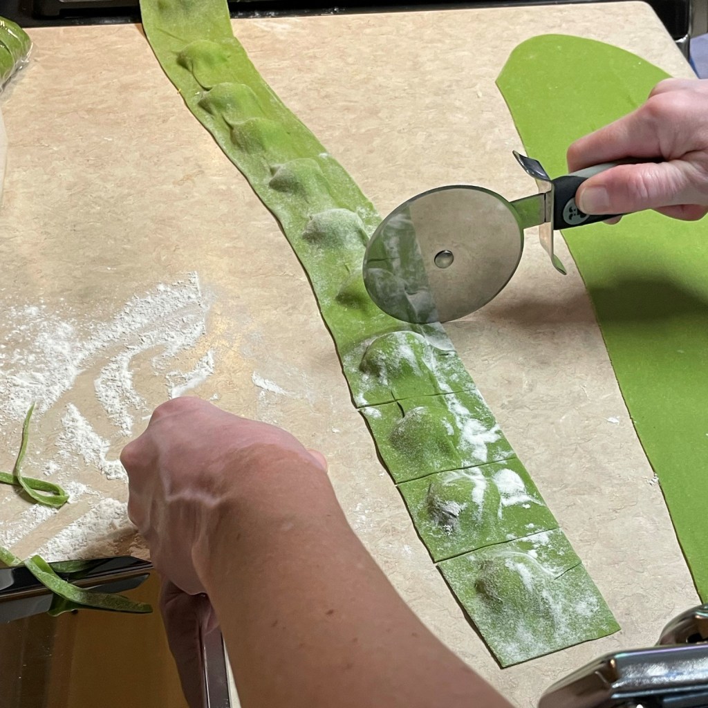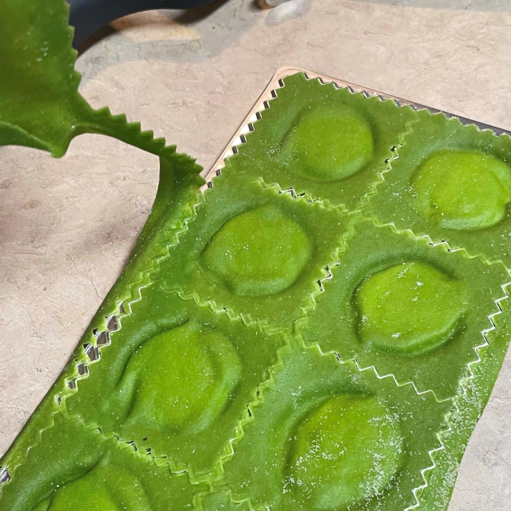Stay tuned for more progress as I go. Until then, let’s talk about this handmade spinach pasta, lovingly wrapped around an easy ricotta and parm-romano filling. I will not be so smug as to imply that handmade pasta is a cinch (because it does take practice), but I will absolutely say that it is worth the effort, and if you have made pasta before, you can make a couple of simple changes to twist up the flavor and color, and you will impress even yourself with the outcome. I’ve made colored and flavored pasta many times before—with spinach, butternut squash, sun-dried tomato, lemon and dried mushrooms as ingredients—but I have already learned some new tricks from Linda Miller Nicholson, and I am excited to share them with you.