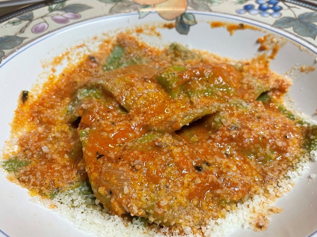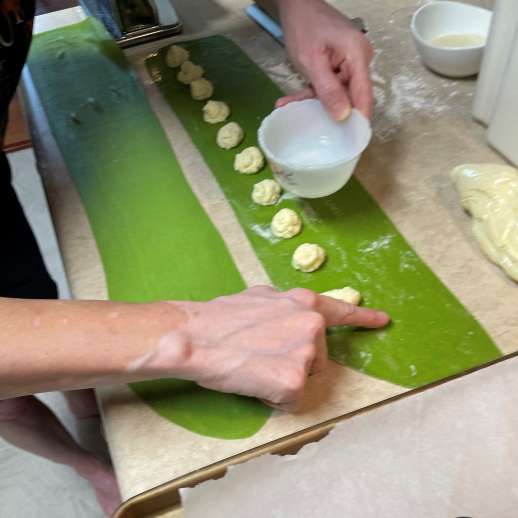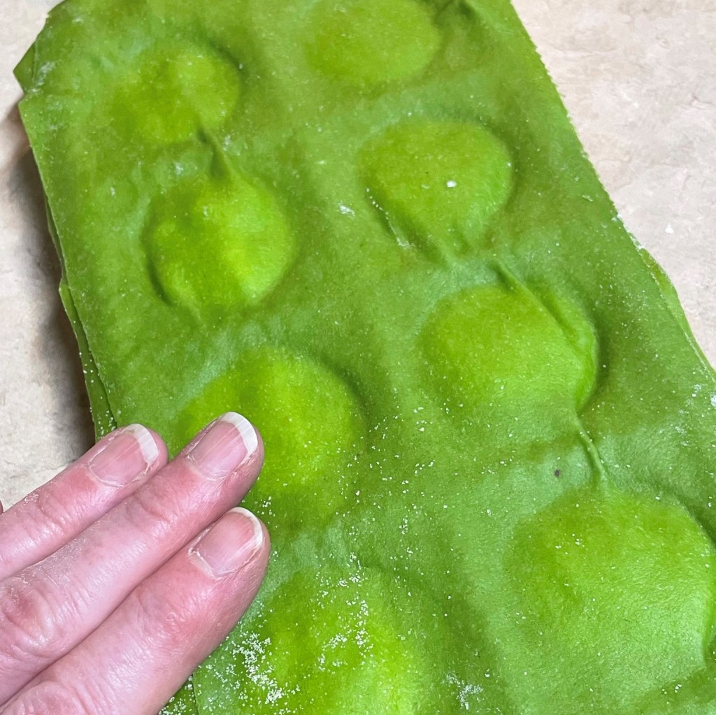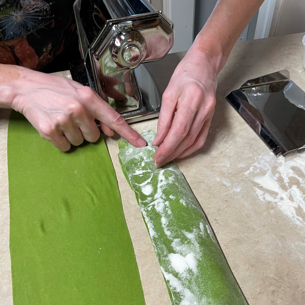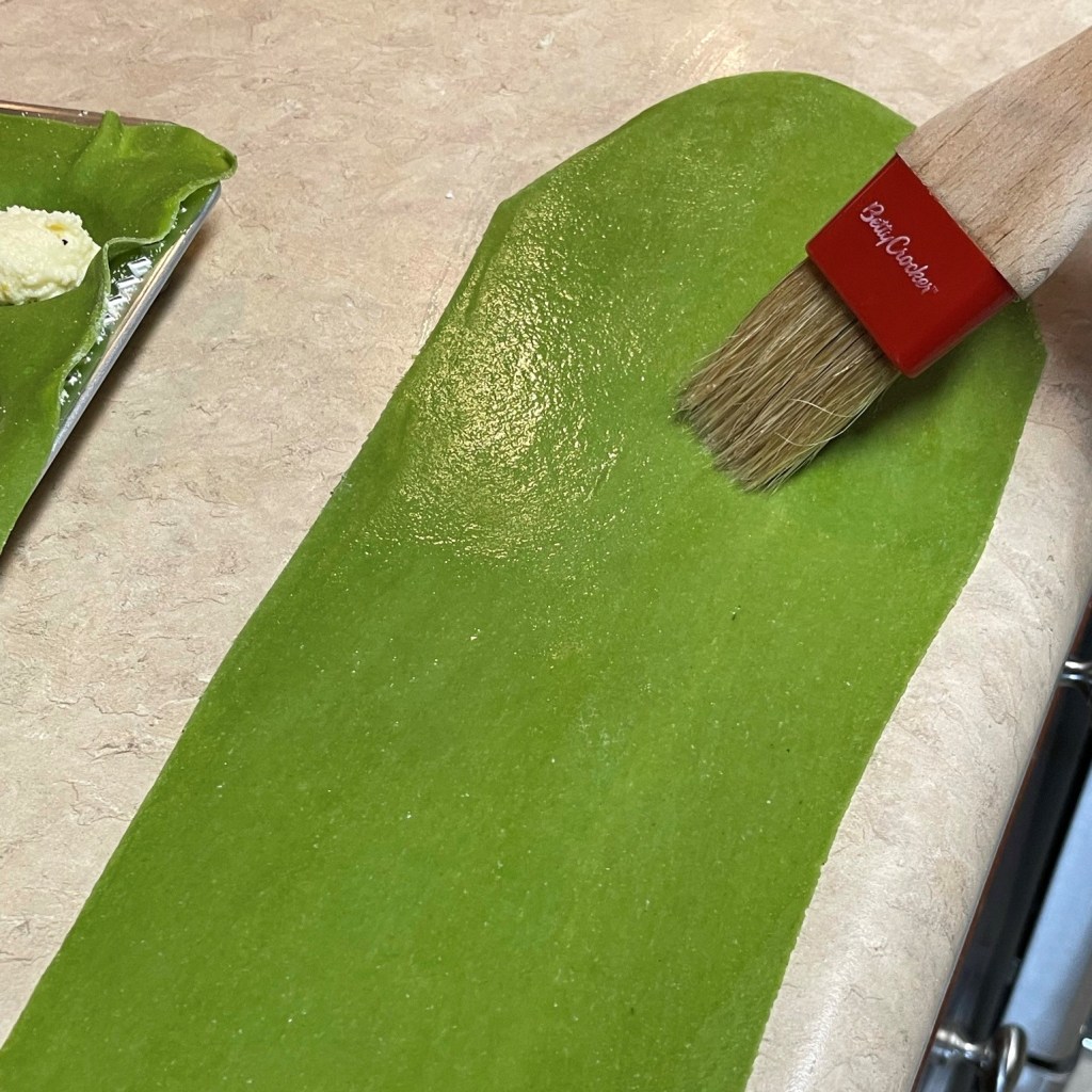 Stay tuned for more progress as I go. Until then, let’s talk about this handmade spinach pasta, lovingly wrapped around an easy ricotta and parm-romano filling. I will not be so smug as to imply that handmade pasta is a cinch (because it does take practice), but I will absolutely say that it is worth the effort, and if you have made pasta before, you can make a couple of simple changes to twist up the flavor and color, and you will impress even yourself with the outcome. I’ve made colored and flavored pasta many times before—with spinach, butternut squash, sun-dried tomato, lemon and dried mushrooms as ingredients—but I have already learned some new tricks from Linda Miller Nicholson, and I am excited to share them with you.